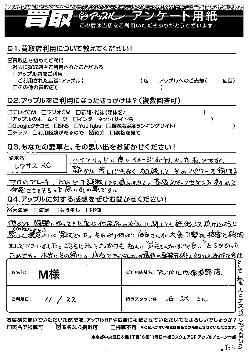 感じ、満足のいく買取でした。それより何より店長さんが大変丁寧な接客と説明をして