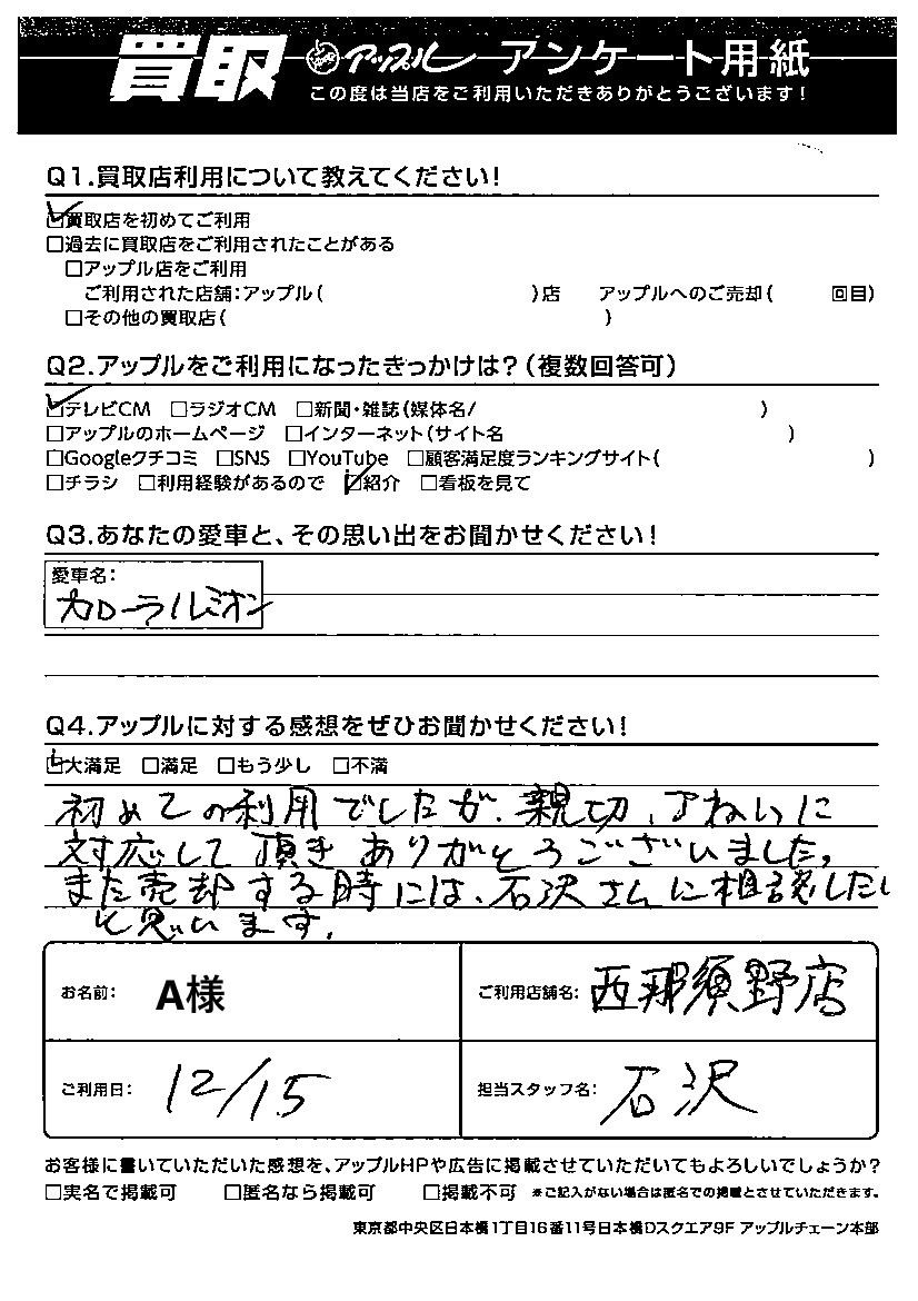 初めての利用でしたが、親切、丁ねいに対応して頂きありがとうございました。