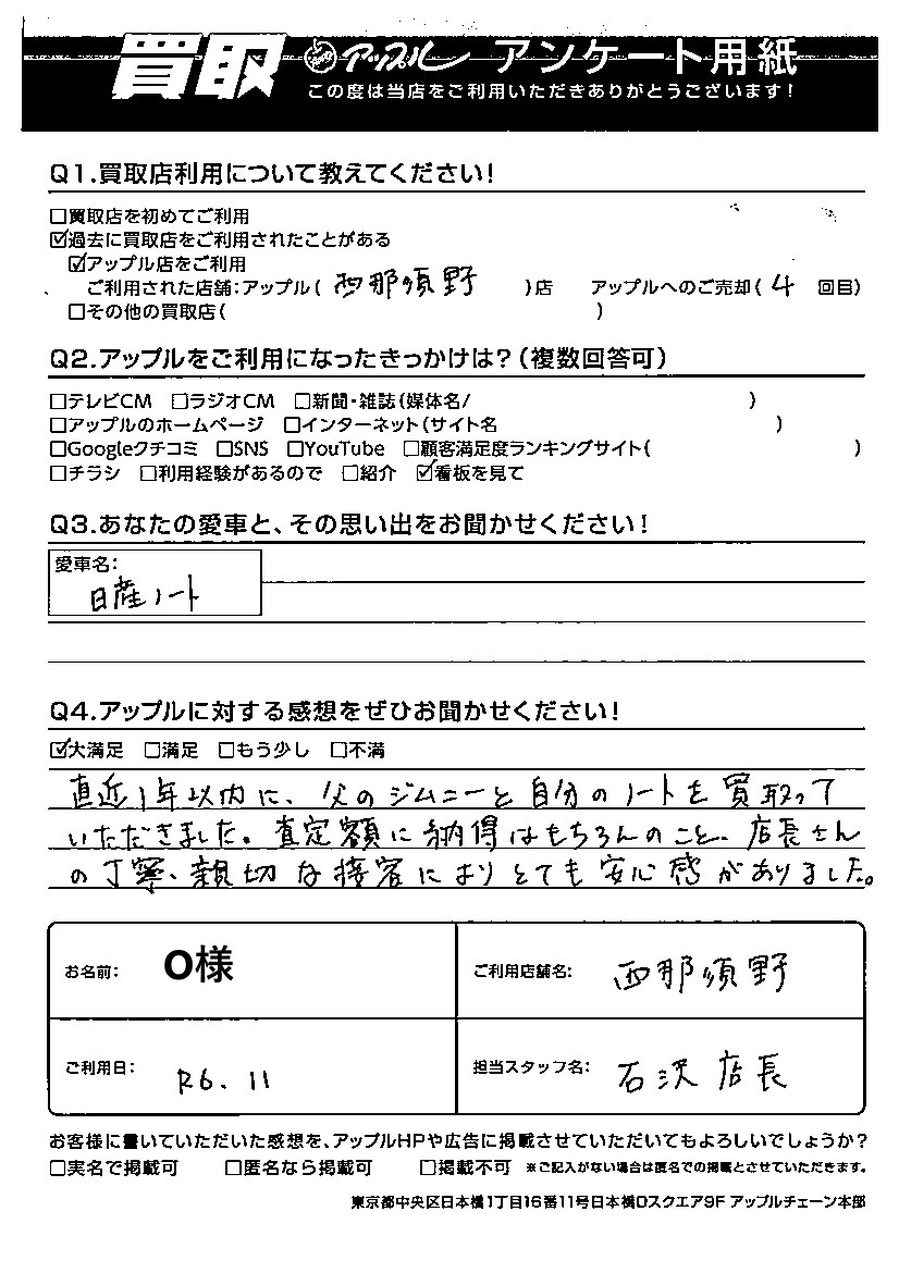 直近1年以内に、父のジムニーと自分のノートを買取っていただきました。査定額に納得はもちろんのこと、店長さんの