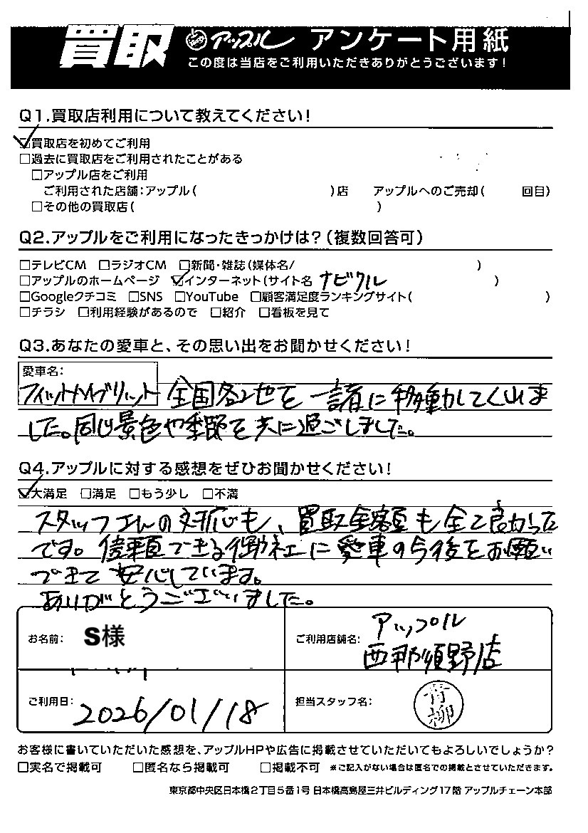 スタッフさんの対応も、買取金額も全て良かったです。信頼できる御社に愛車の今後をお願いできて安心しています。