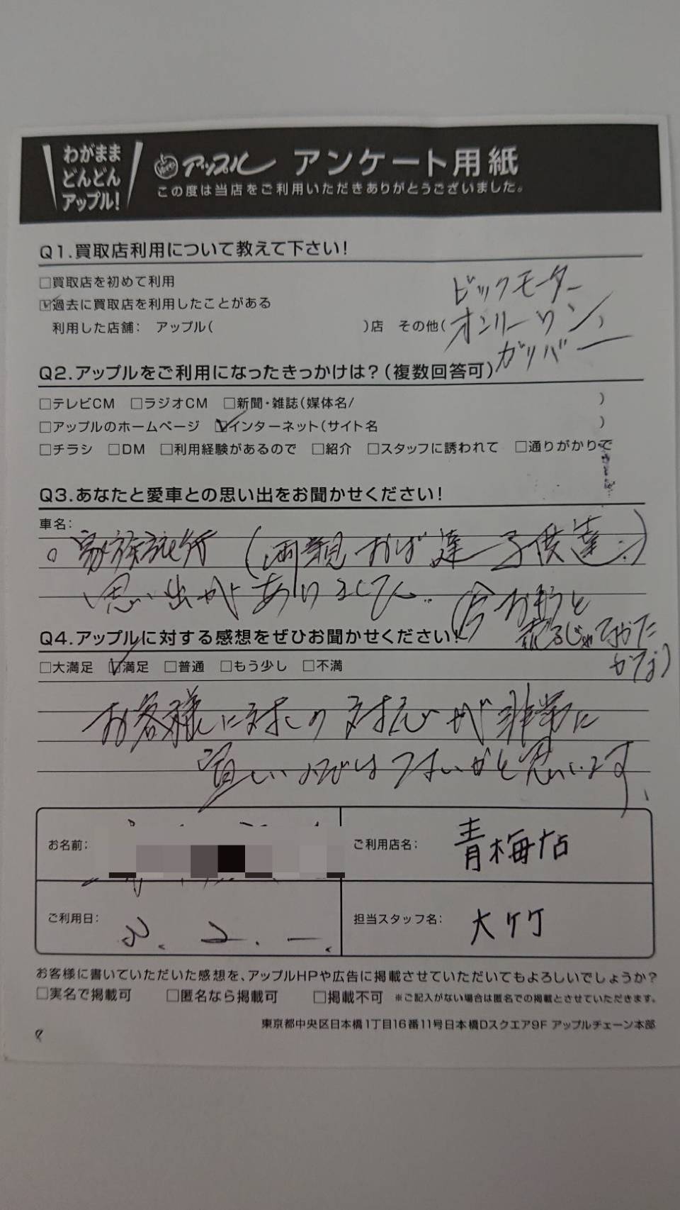 お車のご相談・ 査定だけでもOK! カンタン 入力 30秒 アップルがブランド買取始めました! お電話でも受付中! 受付時間10:00 ~ 19:00 0120-78-6610 お車のご相談・ 査定だけでもOK! カンタン 入力 30秒 アップルがブランド買取始めました! お電話でも受付中! 受付時間10:00 ~ 19:00 0120-78-6610 アップルがブランド買取始めました! お電話でも受付中! 受付時間10:00 ~ 19:00 0120-78-6610 店舗情報 在庫車 スタッフ紹介 ブログ お客様の声 キャンペーン 無料査定 click お客様の声 ご記入日: 2021/02/02 匿名希望様 車名:日産 エルグランド 家族旅行(両親おば達子供達)思い出がありました。(今おもうと売るんじゃなかったかな)お客様に対しの対応が非常に宜しいのではないかと思います。 前へ 次へ お客様の声一覧を見る