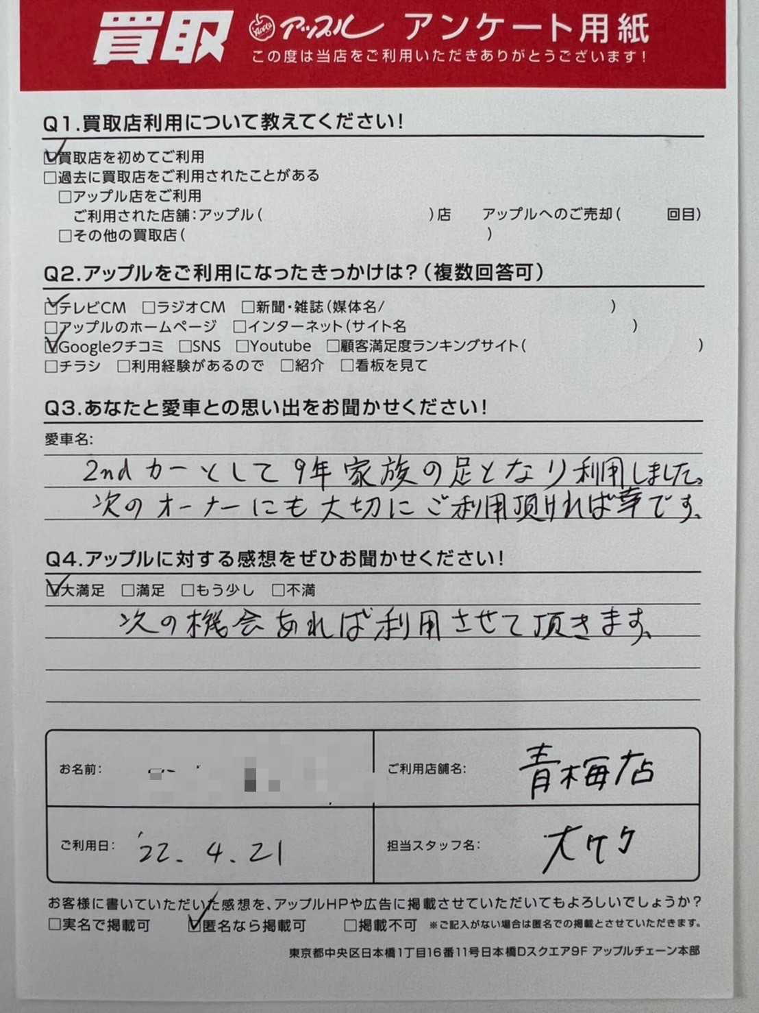 お車のご相談・ 査定だけでもOK! カンタン 入力 30秒 アップルがブランド買取始めました! お電話でも受付中! 受付時間10:00 ~ 19:00 0120-78-6610 お車のご相談・ 査定だけでもOK! カンタン 入力 30秒 アップルがブランド買取始めました! お電話でも受付中! 受付時間10:00 ~ 19:00 0120-78-6610 アップルがブランド買取始めました! お電話でも受付中! 受付時間10:00 ~ 19:00 0120-78-6610 店舗情報 在庫車 スタッフ紹介 ブログ お客様の声 キャンペーン 無料査定 click お客様の声 ご記入日: 2022/06/12 匿名希望様 車名:ホンダ N-ONE ご利用日 2022-04-212ndカーとして9年家族の足となり利用しました。次のオーナーにも大切にご利用いただければ幸いです。次の機会あれば利用させて頂きます。 前へ 次へ お客様の声一覧を見る
