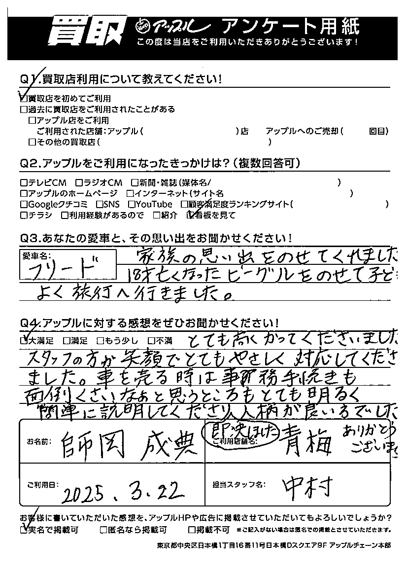 師岡成典様 車名:ホンダ フリード(H28年9月以降のハイブリッド含む)