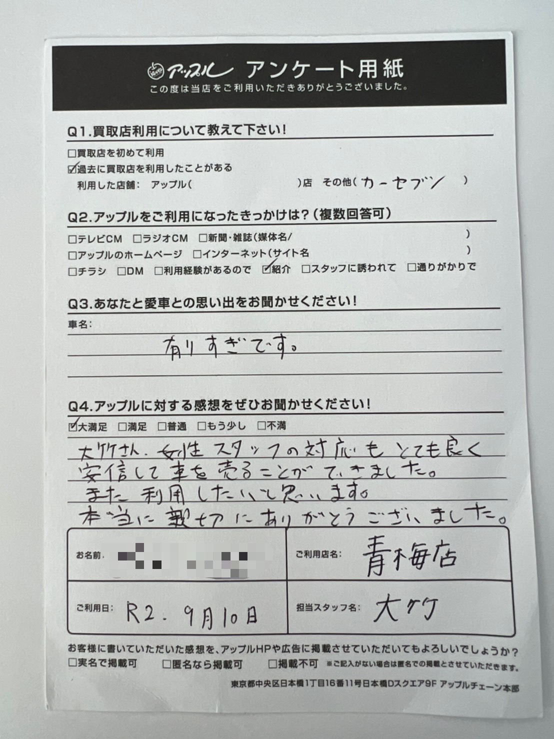 お車のご相談・ 査定だけでもOK! カンタン 入力 30秒 アップルがブランド買取始めました! お電話でも受付中! 受付時間10:00 ~ 19:00 0120-78-6610 お車のご相談・ 査定だけでもOK! カンタン 入力 30秒 アップルがブランド買取始めました! お電話でも受付中! 受付時間10:00 ~ 19:00 0120-78-6610 アップルがブランド買取始めました! お電話でも受付中! 受付時間10:00 ~ 19:00 0120-78-6610 店舗情報 在庫車 スタッフ紹介 ブログ お客様の声 キャンペーン 無料査定 click お客様の声 ご記入日: 2020/09/10 匿名希望様 車名:スズキ ワゴンR 大竹さん・女性スタッフの対応もとても良く安心して車を売る事ができました。また利用したいと思います。本当に親切にありがとうございました。 前へ 次へ お客様の声一覧を見る