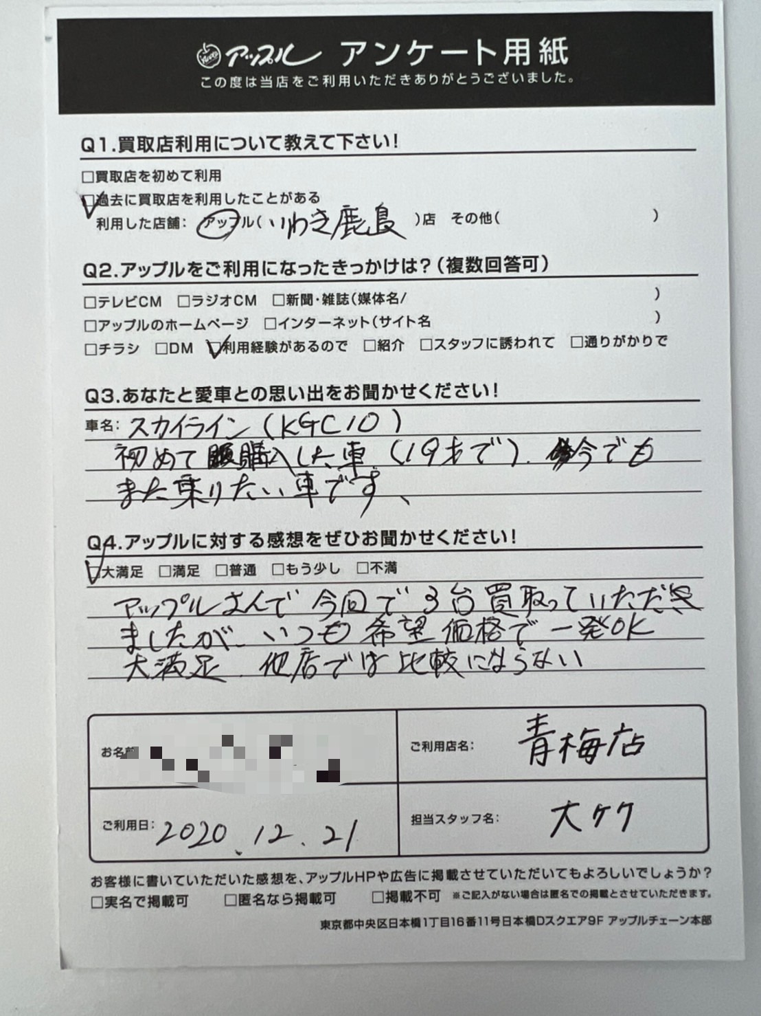 お車のご相談・ 査定だけでもOK! カンタン 入力 30秒 アップルがブランド買取始めました! お電話でも受付中! 受付時間10:00 ~ 19:00 0120-78-6610 お車のご相談・ 査定だけでもOK! カンタン 入力 30秒 アップルがブランド買取始めました! お電話でも受付中! 受付時間10:00 ~ 19:00 0120-78-6610 アップルがブランド買取始めました! お電話でも受付中! 受付時間10:00 ~ 19:00 0120-78-6610 店舗情報 在庫車 スタッフ紹介 ブログ お客様の声 キャンペーン 無料査定 click お客様の声 ご記入日: 2020/12/21 匿名希望様 車名:日産 セレナ アップルさんで今回で3台買取っていただきましたが、いつも希望価格一発OK大満足。他店では比較にならない 前へ 次へ お客様の声一覧を見る