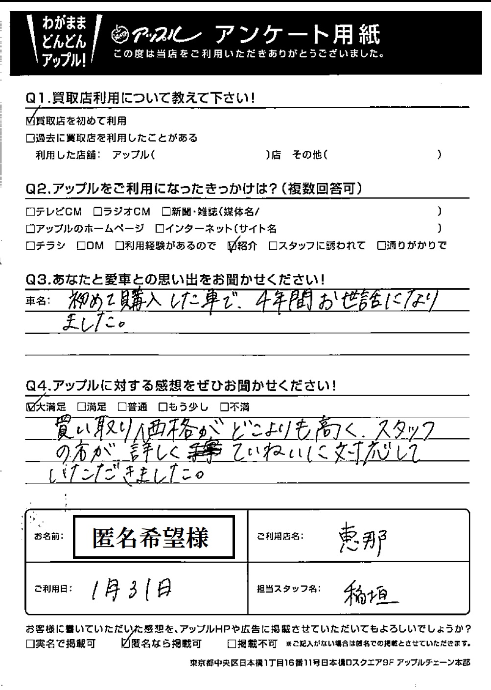 お車のご相談・ 査定だけでもOK! カンタン 入力 30秒 アップルがブランド買取始めました! お電話でも受付中! 受付時間10:00~ 19:00 0573-26-3033 お車のご相談・ 査定だけでもOK! カンタン 入力 30秒 アップルがブランド買取始めました! お電話でも受付中! 受付時間10:00~ 19:00 0573-26-3033 アップルがブランド買取始めました! お電話でも受付中! 受付時間10:00~ 19:00 0573-26-3033 店舗情報 在庫車 スタッフ紹介 ブログ お客様の声 キャンペーン お得 無料査定 click お客様の声 ご記入日: 2021/01/31 匿名希望様 Q あなたと愛車との思い出をお聞かせください!初めて購入した車で、4年間お世話になりました。Q アップルに対する感想をぜひお聞かせください!感想:大満足買い取り価格がどこよりも高く、スタッフの方が、詳しくていねいに対応していただきました。 前へ 次へ お客様の声一覧を見る