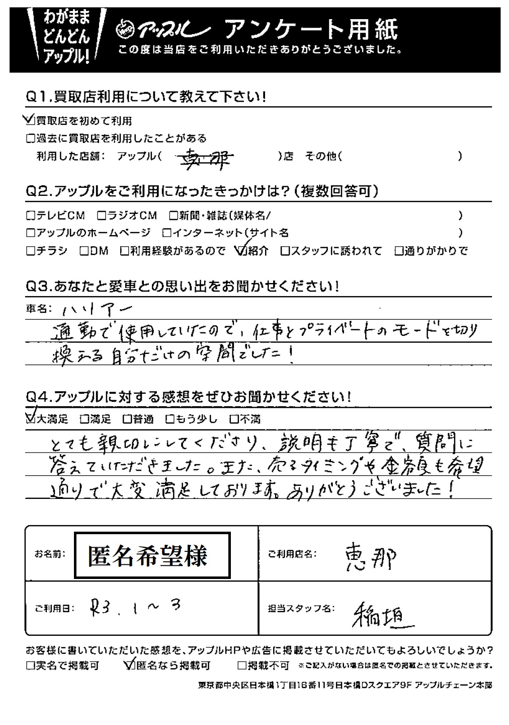 匿名希望様 車名:トヨタ ハリアー (H25年12月~のハイブリッド含む)