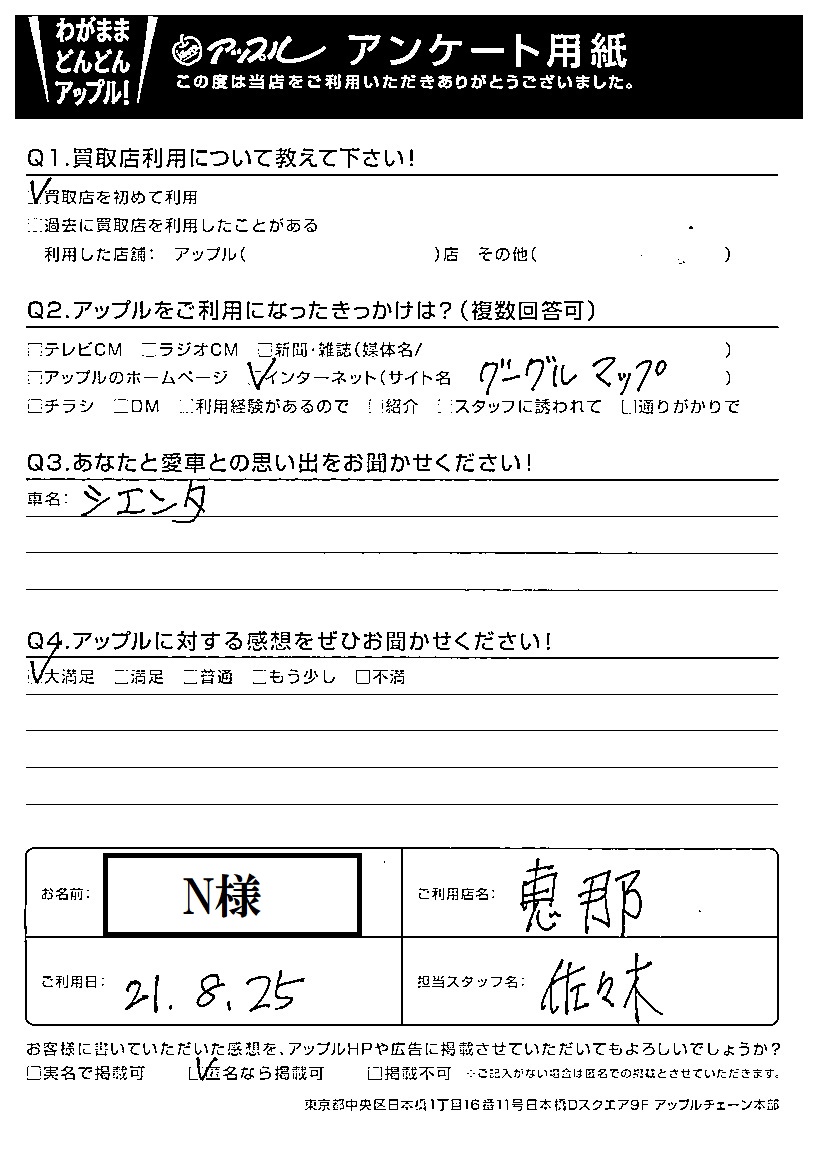 お車のご相談・ 査定だけでもOK! カンタン 入力 30秒 アップルがブランド買取始めました! お電話でも受付中! 受付時間10:00~ 19:00 0573-26-3033 お車のご相談・ 査定だけでもOK! カンタン 入力 30秒 アップルがブランド買取始めました! お電話でも受付中! 受付時間10:00~ 19:00 0573-26-3033 アップルがブランド買取始めました! お電話でも受付中! 受付時間10:00~ 19:00 0573-26-3033 店舗情報 在庫車 スタッフ紹介 ブログ お客様の声 キャンペーン お得 無料査定 click お客様の声 ご記入日: 2021/08/25 N様 車名:トヨタ シエンタ Q アップルに対する感想をぜひお聞かせください!感想:大満足 前へ 次へ お客様の声一覧を見る