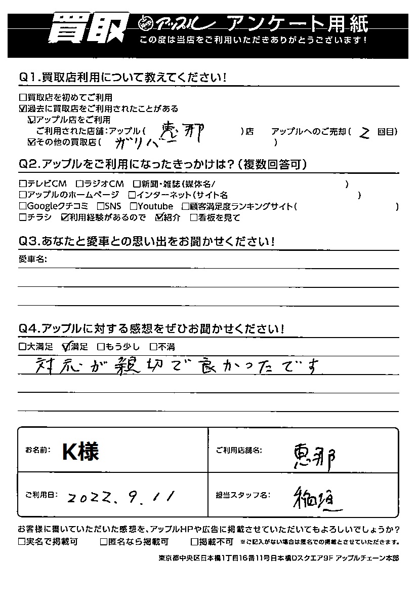 お車のご相談・ 査定だけでもOK! カンタン 入力 30秒 アップルがブランド買取始めました! お電話でも受付中! 受付時間10:00~ 19:00 0573-26-3033 お車のご相談・ 査定だけでもOK! カンタン 入力 30秒 アップルがブランド買取始めました! お電話でも受付中! 受付時間10:00~ 19:00 0573-26-3033 アップルがブランド買取始めました! お電話でも受付中! 受付時間10:00~ 19:00 0573-26-3033 店舗情報 在庫車 スタッフ紹介 ブログ お客様の声 キャンペーン お得 無料査定 click お客様の声 ご記入日: 2022/09/11 K様 Q アップルに対する感想をぜひお聞かせください!感想:満足対応が親切で良かったです。 前へ 次へ お客様の声一覧を見る