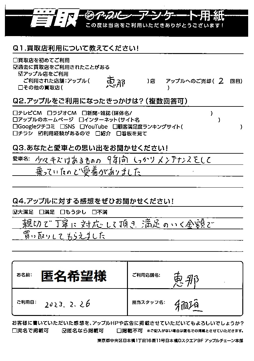 匿名希望 様 担当:稲垣