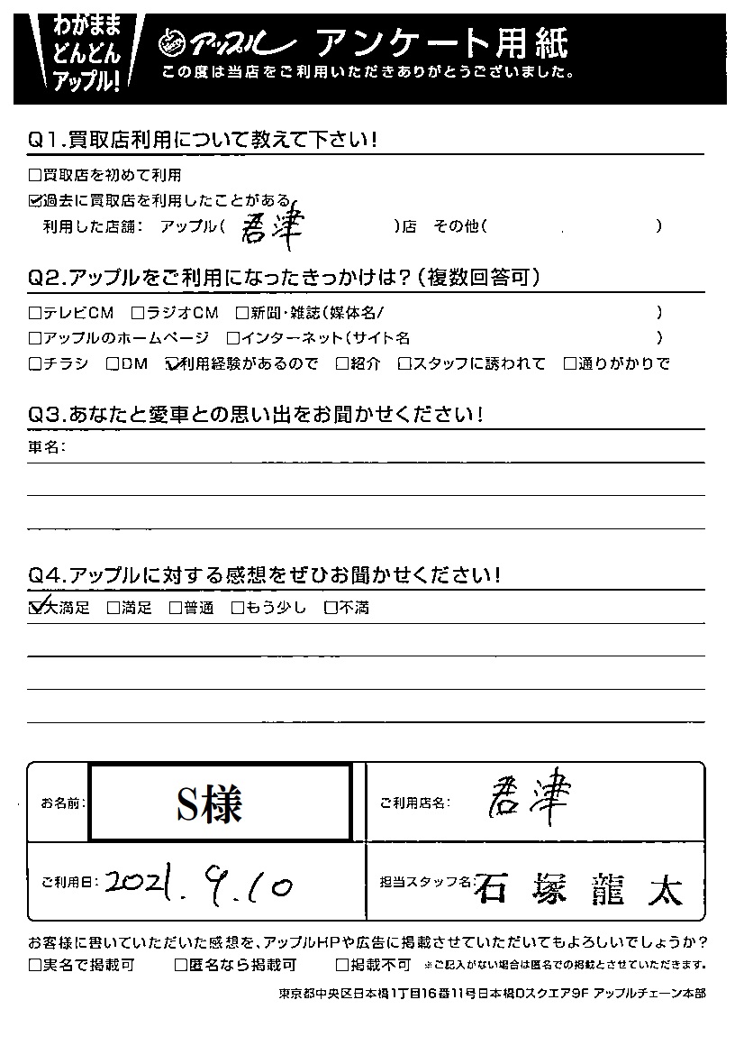 お車のご相談・ 査定だけでもOK! カンタン 入力 30秒 アップルがブランド買取始めました! お電話でも受付中! 受付時間10:00~18:00 0120-495-400 お車のご相談・ 査定だけでもOK! カンタン 入力 30秒 アップルがブランド買取始めました! お電話でも受付中! 受付時間10:00~18:00 0120-495-400 アップルがブランド買取始めました! お電話でも受付中! 受付時間10:00~18:00 0120-495-400 店舗情報 在庫車 スタッフ紹介 ブログ お客様の声 キャンペーン 無料査定 click お客様の声 ご記入日: 2021/09/10 S様 Q アップルに対する感想をぜひお聞かせください!感想:大満足 前へ 次へ お客様の声一覧を見る
