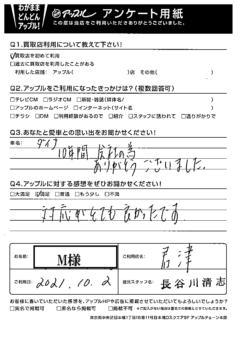 お車のご相談・ 査定だけでもOK! カンタン 入力 30秒 アップルがブランド買取始めました! お電話でも受付中! 受付時間10:00~18:00 0120-495-400 お車のご相談・ 査定だけでもOK! カンタン 入力 30秒 アップルがブランド買取始めました! お電話でも受付中! 受付時間10:00~18:00 0120-495-400 アップルがブランド買取始めました! お電話でも受付中! 受付時間10:00~18:00 0120-495-400 店舗情報 在庫車 スタッフ紹介 ブログ お客様の声 キャンペーン 無料査定 click お客様の声 ご記入日: 2021/10/02 M様 車名:トヨタ ダイナ Q あなたと愛車との思い出をお聞かせください!10年間会社の為ありがとうございました。Q アップルに対する感想をぜひお聞かせください!感想:満足対応がとても良かったです。 前へ 次へ お客様の声一覧を見る