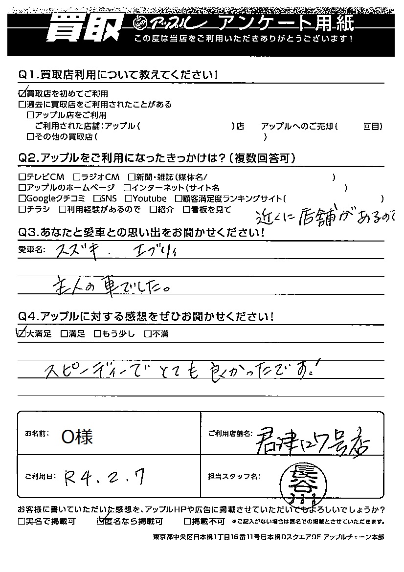 お車のご相談・ 査定だけでもOK! カンタン 入力 30秒 アップルがブランド買取始めました! お電話でも受付中! 受付時間10:00~18:00 0120-495-400 お車のご相談・ 査定だけでもOK! カンタン 入力 30秒 アップルがブランド買取始めました! お電話でも受付中! 受付時間10:00~18:00 0120-495-400 アップルがブランド買取始めました! お電話でも受付中! 受付時間10:00~18:00 0120-495-400 店舗情報 在庫車 スタッフ紹介 ブログ お客様の声 キャンペーン 無料査定 click お客様の声 ご記入日: 2022/02/07 O様 車名:スズキ エブリイ Q あなたと愛車との思い出をお聞かせください!主人の車でした。Q アップルに対する感想をぜひお聞かせください!感想:大満足スピーディーでとても良かったです! 前へ 次へ お客様の声一覧を見る
