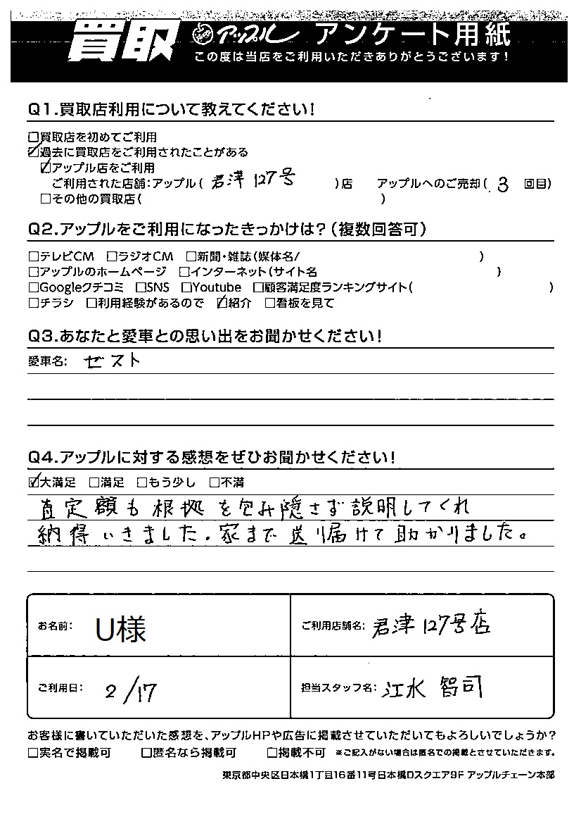 お車のご相談・ 査定だけでもOK! カンタン 入力 30秒 アップルがブランド買取始めました! お電話でも受付中! 受付時間10:00~18:00 0120-495-400 お車のご相談・ 査定だけでもOK! カンタン 入力 30秒 アップルがブランド買取始めました! お電話でも受付中! 受付時間10:00~18:00 0120-495-400 アップルがブランド買取始めました! お電話でも受付中! 受付時間10:00~18:00 0120-495-400 店舗情報 在庫車 スタッフ紹介 ブログ お客様の声 キャンペーン 無料査定 click お客様の声 ご記入日: 2022/02/17 U様 車名:ホンダ ゼスト Q アップルに対する感想をぜひお聞かせください!感想:大満足査定額も根拠も包み隠さず説明してくれ納得いきました。家まで送り届けて助かりました。 前へ 次へ お客様の声一覧を見る