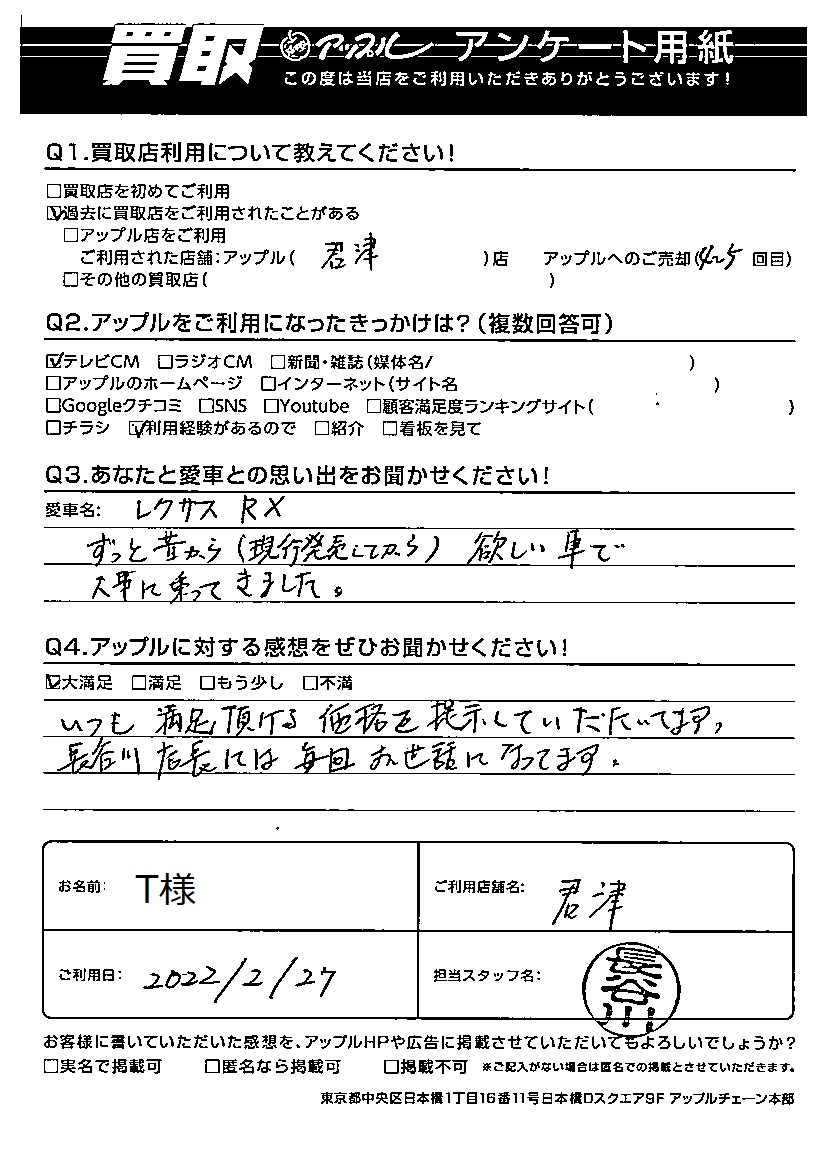 T様 車名:レクサス RX (国内仕様 右H(H27年10月~HYBRID含)