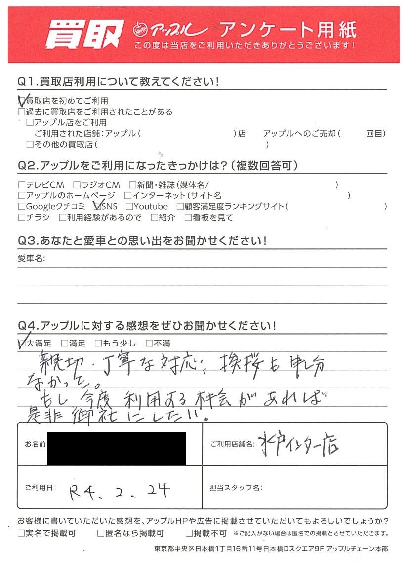 お車のご相談・ 査定だけでもOK! カンタン 入力 30秒 アップルがブランド買取始めました! お電話でも受付中! 受付時間10:00 ~ 18:30 0120-366-310 お車のご相談・ 査定だけでもOK! カンタン 入力 30秒 アップルがブランド買取始めました! お電話でも受付中! 受付時間10:00 ~ 18:30 0120-366-310 アップルがブランド買取始めました! お電話でも受付中! 受付時間10:00 ~ 18:30 0120-366-310 店舗情報 在庫車 スタッフ紹介 ブログ お客様の声 キャンペーン お得 無料査定 click お客様の声 ご記入日: 2022/06/09 M様 車名:トヨタ エスティマ 【貴方と愛車の思い出をお聞かせ下さい!】【アップルに対する感想をお聞かせください】親切、丁寧な対応、挨拶も申し分なかった。もし今度利用する機会がえれば是非御社にしたい。 前へ 次へ お客様の声一覧を見る