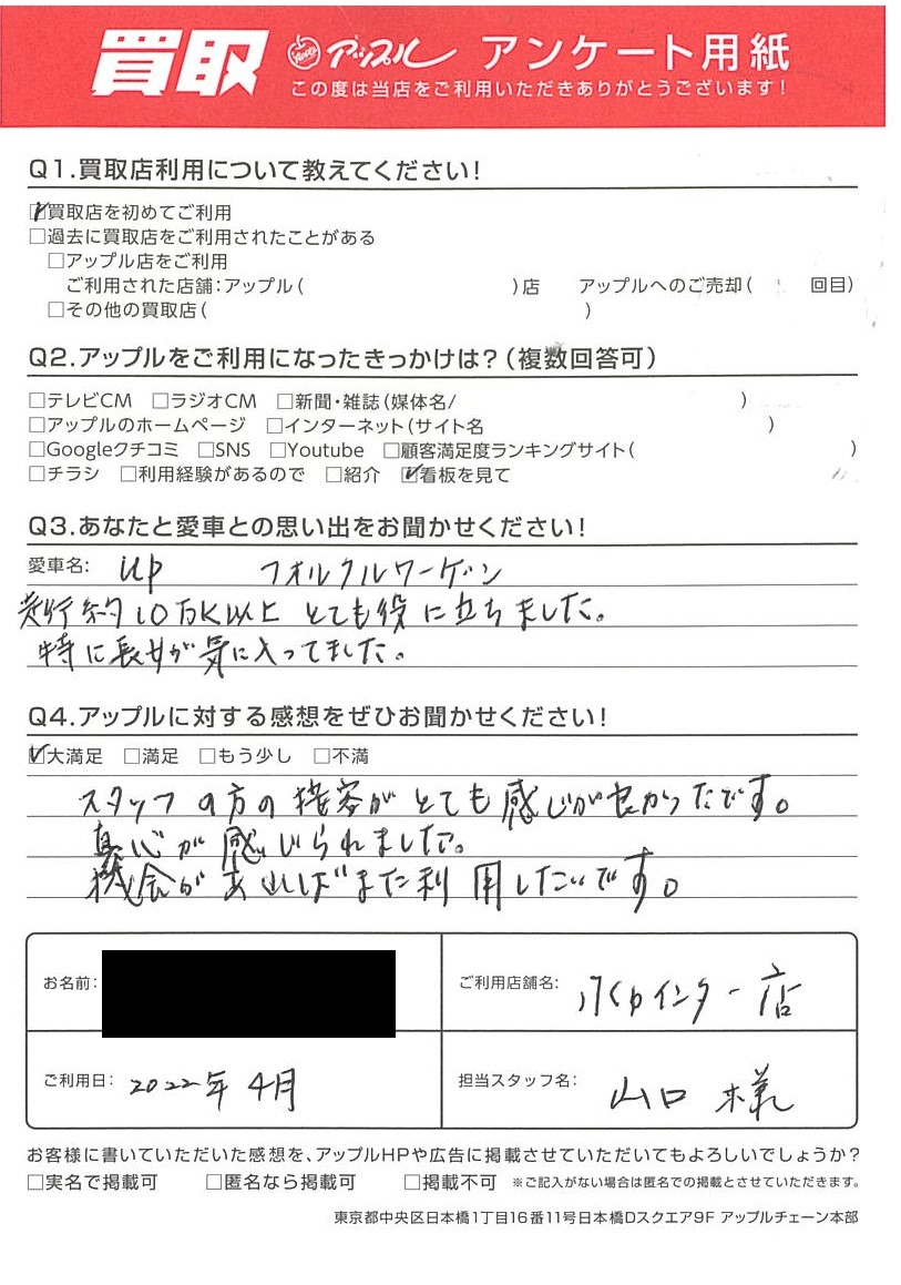 お車のご相談・ 査定だけでもOK! カンタン 入力 30秒 アップルがブランド買取始めました! お電話でも受付中! 受付時間10:00 ~ 18:30 0120-366-310 お車のご相談・ 査定だけでもOK! カンタン 入力 30秒 アップルがブランド買取始めました! お電話でも受付中! 受付時間10:00 ~ 18:30 0120-366-310 アップルがブランド買取始めました! お電話でも受付中! 受付時間10:00 ~ 18:30 0120-366-310 店舗情報 在庫車 スタッフ紹介 ブログ お客様の声 キャンペーン お得 無料査定 click お客様の声 ご記入日: 2022/04/07 水戸市 M様 車名:フォルクスワーゲン up! 【貴方と愛車との思い出をお聞かせください。】走行距離10万キロ以上 とても役にたちました。得に長女が気に入ってました。【アップルに対する感想をお聞かせください。】スタッフの方の接客がとても感じがよかったです。真心が感じられました。機会があったらまた利用したいです。 前へ 次へ お客様の声一覧を見る