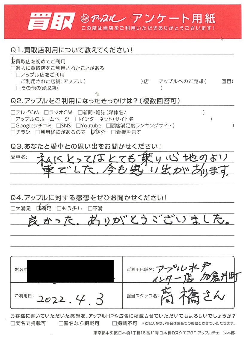 お車のご相談・ 査定だけでもOK! カンタン 入力 30秒 アップルがブランド買取始めました! お電話でも受付中! 受付時間10:00 ~ 18:30 0120-366-310 お車のご相談・ 査定だけでもOK! カンタン 入力 30秒 アップルがブランド買取始めました! お電話でも受付中! 受付時間10:00 ~ 18:30 0120-366-310 アップルがブランド買取始めました! お電話でも受付中! 受付時間10:00 ~ 18:30 0120-366-310 店舗情報 在庫車 スタッフ紹介 ブログ お客様の声 キャンペーン お得 無料査定 click お客様の声 ご記入日: 2022/04/03 水戸市 A様 車名:ダイハツ タント 【貴方と愛車との思い出をお聞かせください。】私にとってはとても乗り心地のよい車でした。今も思い出があります。【アップルに対する感想をお聞かせください。】良かった。ありがとうございました。 前へ 次へ お客様の声一覧を見る