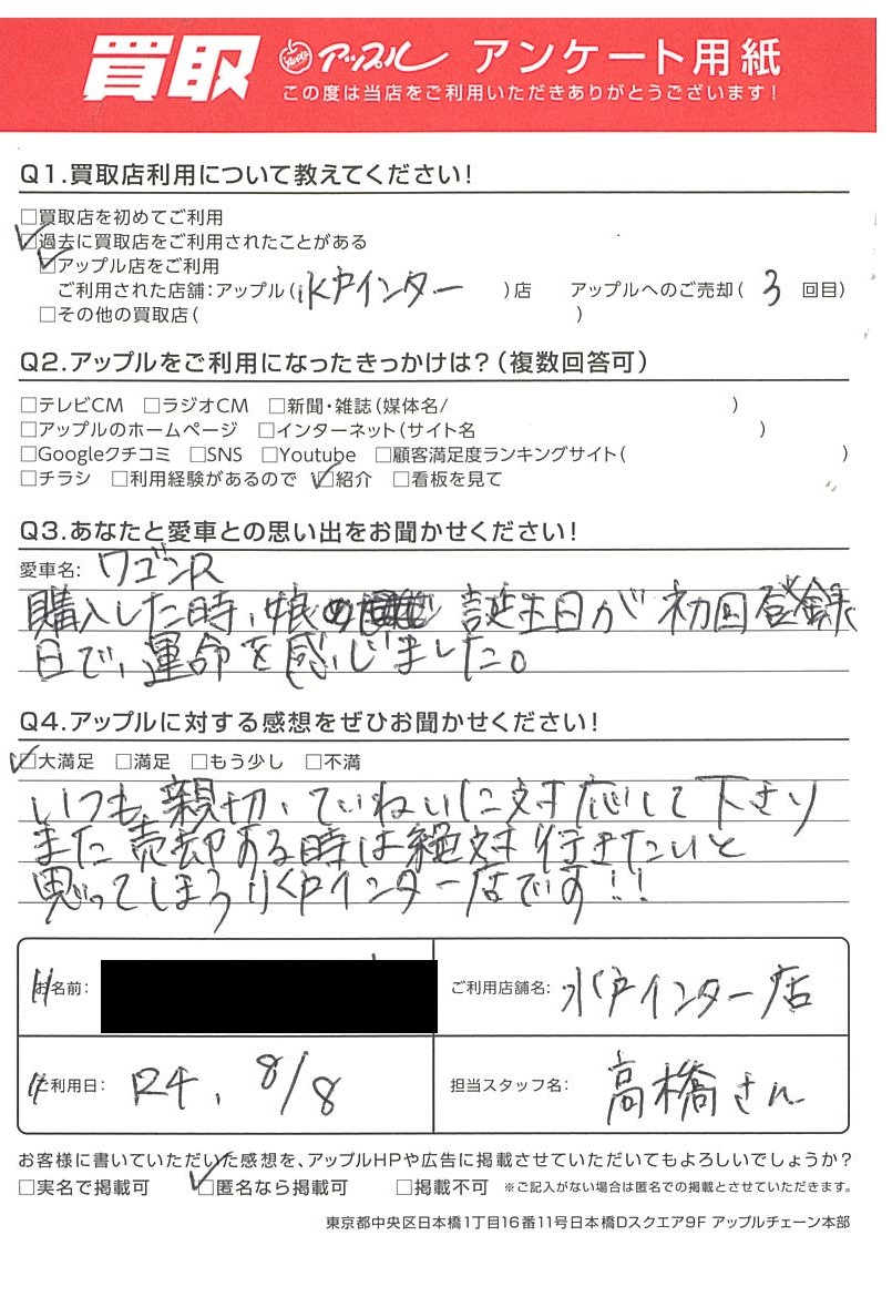 お車のご相談・ 査定だけでもOK! カンタン 入力 30秒 アップルがブランド買取始めました! お電話でも受付中! 受付時間10:00 ~ 18:30 0120-366-310 お車のご相談・ 査定だけでもOK! カンタン 入力 30秒 アップルがブランド買取始めました! お電話でも受付中! 受付時間10:00 ~ 18:30 0120-366-310 アップルがブランド買取始めました! お電話でも受付中! 受付時間10:00 ~ 18:30 0120-366-310 店舗情報 在庫車 スタッフ紹介 ブログ お客様の声 キャンペーン お得 無料査定 click お客様の声 ご記入日: 2022/08/08 笠間市 Y様 車名:スズキ ワゴンR 【貴方と愛車との思い出をお聞かせください。】購入時、娘の誕生日が初回登録日で、運命を感じました。【アップルに対する感想をぜひお聞かせください。】いつも親切で、丁寧に対応してくださりまた売却する時は絶対行きたいと思ってしまう水戸インター店です。 前へ 次へ お客様の声一覧を見る