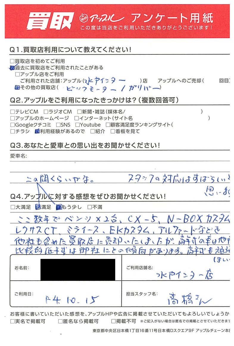ここ数年でベンツ3台、CX-5、N-BOXカスタム、レクサスCT、ミライース、EKカスタム、アルファードなどを他社も含めた買取店に売却いたしましたが高年式の車は他社比較的に低年式は御社にとの傾向があります。
