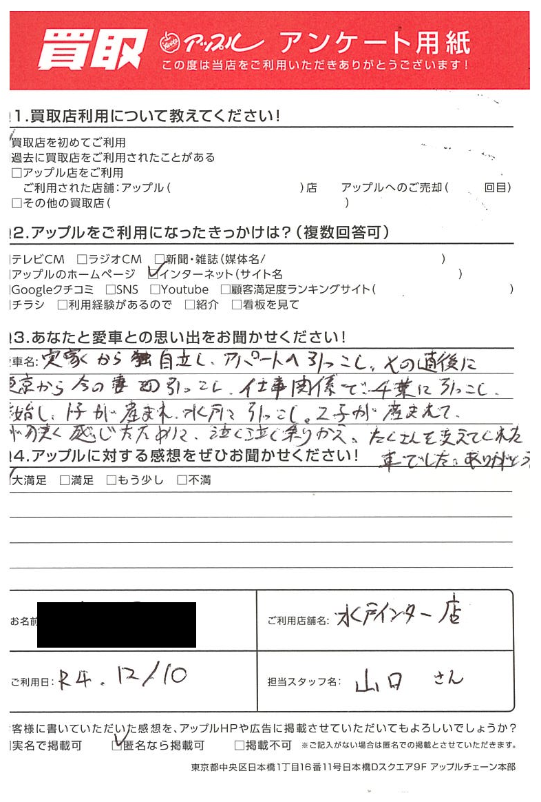 実家から自立し、アパートへ引っ越しその直後に東京から今の妻の引っ越し、仕事関係で千葉に引っ越し結婚し、1子が生まれ、水戸に引っ越し、2子が生まれて、車が狭く感じたために泣く泣く乗り換えたくさん支えてくれた車でした。