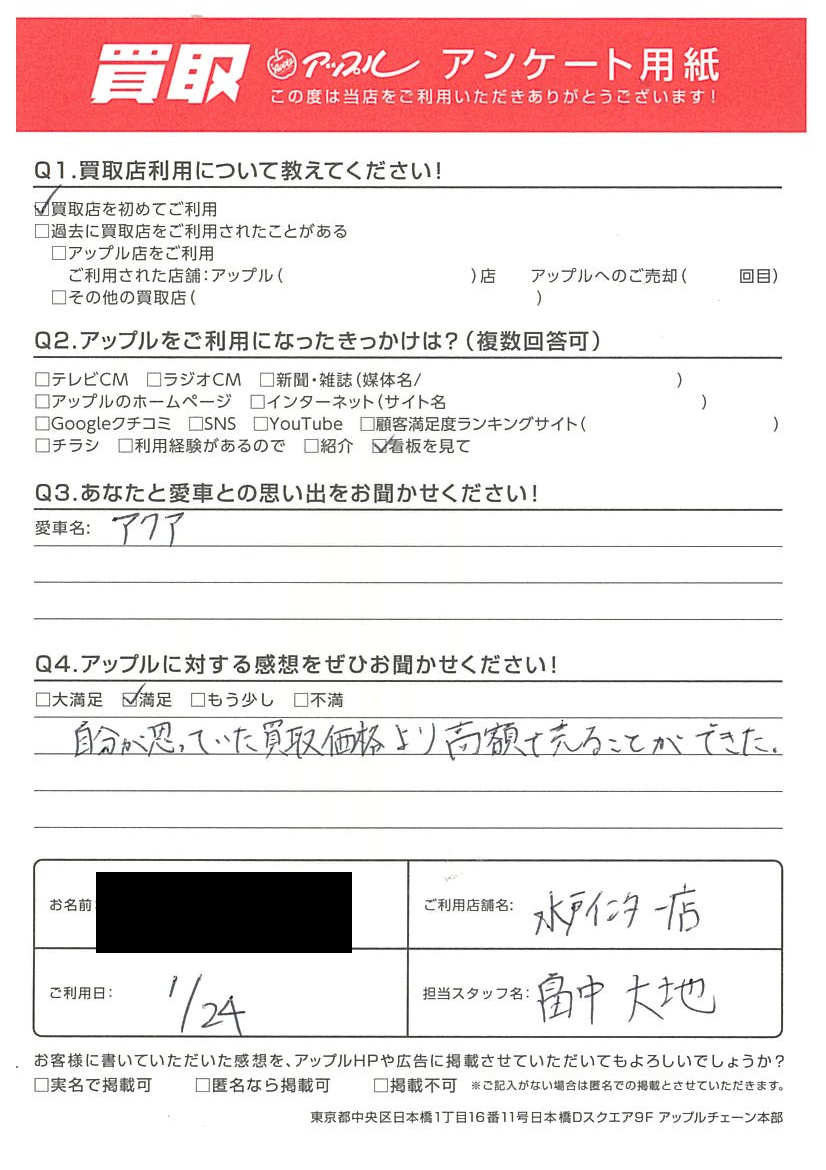 お車のご相談・ 査定だけでもOK! カンタン 入力 30秒 アップルがブランド買取始めました! お電話でも受付中! 受付時間10:00 ~ 18:30 0120-366-310 お車のご相談・ 査定だけでもOK! カンタン 入力 30秒 アップルがブランド買取始めました! お電話でも受付中! 受付時間10:00 ~ 18:30 0120-366-310 アップルがブランド買取始めました! お電話でも受付中! 受付時間10:00 ~ 18:30 0120-366-310 店舗情報 在庫車 スタッフ紹介 ブログ お客様の声 キャンペーン お得 無料査定 click お客様の声 ご記入日: 2023/01/24 水戸市 T様 車名:トヨタ アクア 【貴方と愛車との思い出をお聞かせください。】アクア【アップルに対する感想をぜひお聞かせください。】自分で思っていた買取価格より高額で売ることができた 前へ 次へ お客様の声一覧を見る