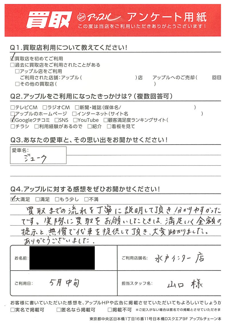 お車のご相談・ 査定だけでもOK! カンタン 入力 30秒 アップルがブランド買取始めました! お電話でも受付中! 受付時間10:00 ~ 18:30 0120-366-310 お車のご相談・ 査定だけでもOK! カンタン 入力 30秒 アップルがブランド買取始めました! お電話でも受付中! 受付時間10:00 ~ 18:30 0120-366-310 アップルがブランド買取始めました! お電話でも受付中! 受付時間10:00 ~ 18:30 0120-366-310 店舗情報 在庫車 スタッフ紹介 ブログ お客様の声 キャンペーン お得 無料査定 click お客様の声 ご記入日: 2024/05/25 茨城町 T様 車名:日産 ジューク 【貴方と愛車との思い出をお聞かせください。】【アップルに対する感想をぜひお聞かせください。】買取までの流れを丁寧に説明して頂き分かりやすかったです。実際に買取をおねがいしたときは満足いく金額の提示と無償で代車を提供頂き、大変助かりました。ありがとうございました。 前へ 次へ お客様の声一覧を見る