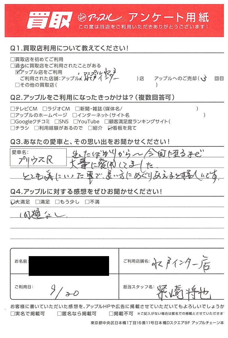 お車のご相談・ 査定だけでもOK! カンタン 入力 30秒 アップルがブランド買取始めました! お電話でも受付中! 受付時間10:00 ~ 18:30 0120-366-310 お車のご相談・ 査定だけでもOK! カンタン 入力 30秒 アップルがブランド買取始めました! お電話でも受付中! 受付時間10:00 ~ 18:30 0120-366-310 アップルがブランド買取始めました! お電話でも受付中! 受付時間10:00 ~ 18:30 0120-366-310 店舗情報 在庫車 スタッフ紹介 ブログ お客様の声 キャンペーン お得 無料査定 click お客様の声 ご記入日: 2024/09/20 那珂市 M様 車名:トヨタ プリウス(2023年3月~のPHVを含む) 【貴方と愛車との思い出をお聞かせください。】でたばかりから今回に至るまで大事に愛用していました。とても気いった車で良い方にめぐりあえると嬉しいです。【アップルに対する感想をぜひお聞かせください。】問題なし 前へ 次へ お客様の声一覧を見る