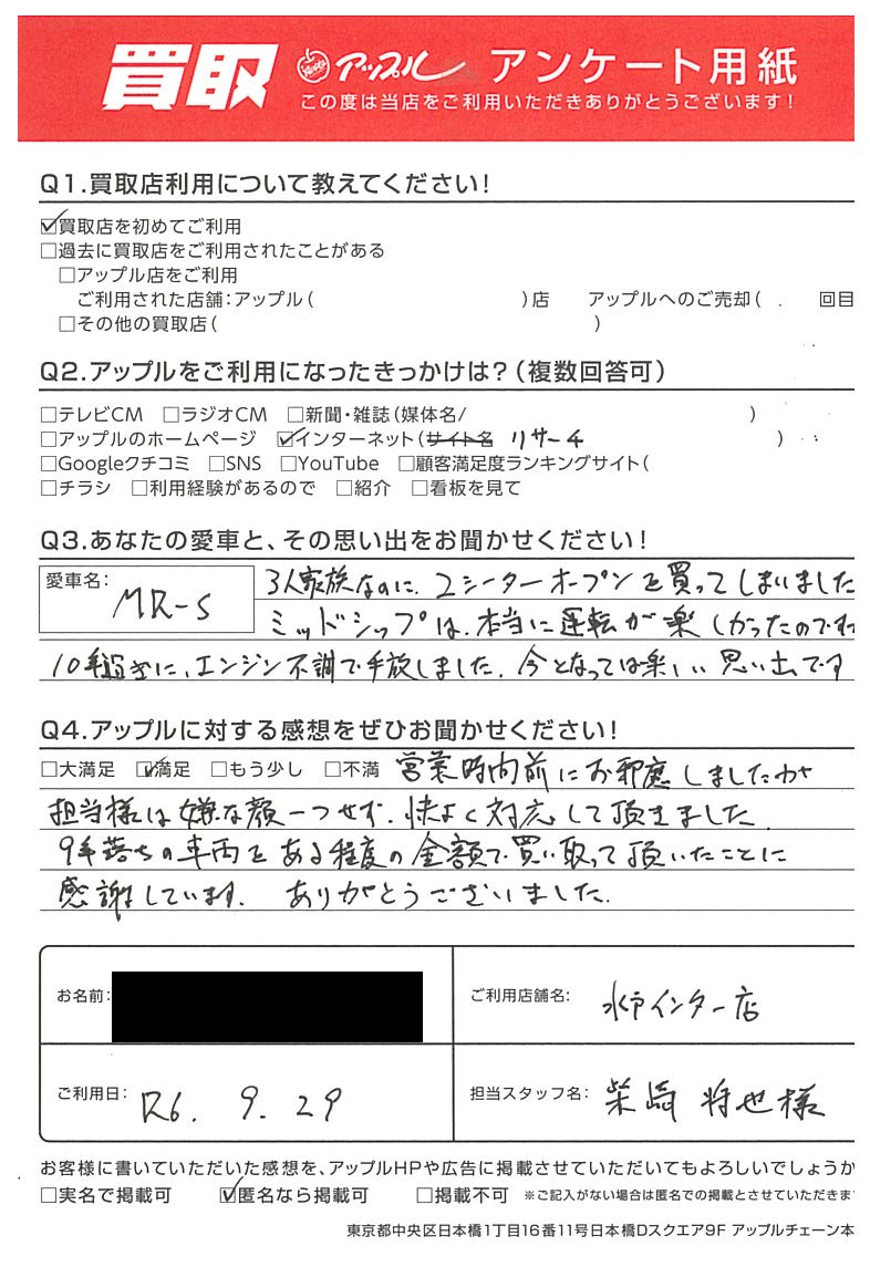 水戸市 I様 車名:トヨタ MR-S