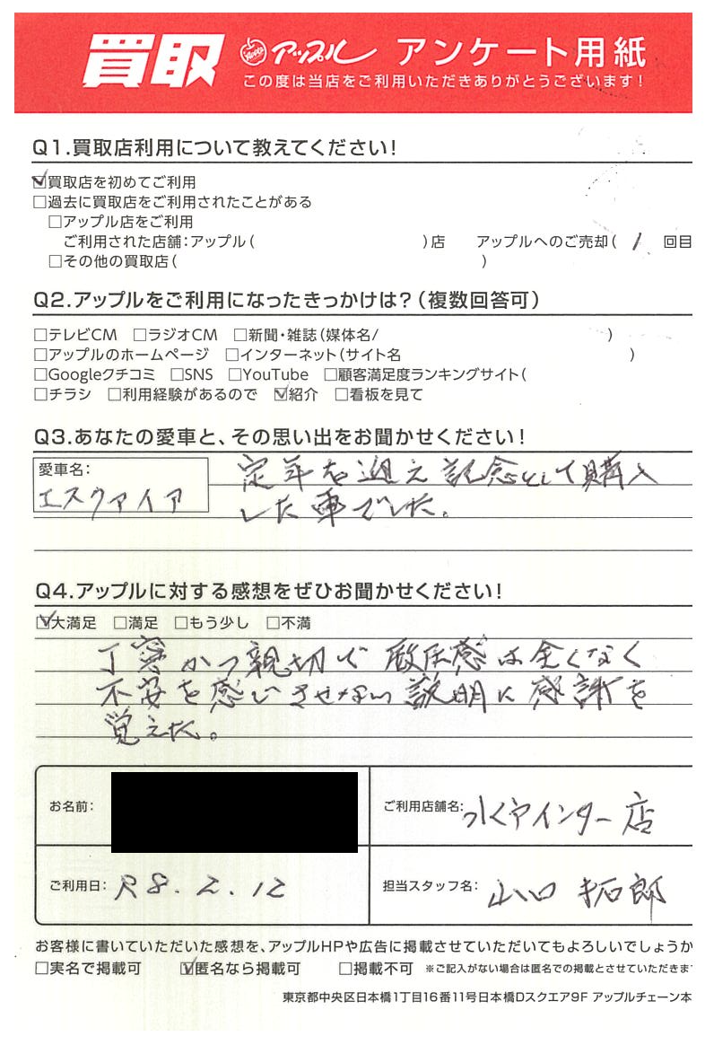 お車のご相談・ 査定だけでもOK! カンタン 入力 30秒 アップルがブランド買取始めました! お電話でも受付中! 受付時間10:00 ~ 18:30 0120-366-310 お車のご相談・ 査定だけでもOK! カンタン 入力 30秒 アップルがブランド買取始めました! お電話でも受付中! 受付時間10:00 ~ 18:30 0120-366-310 アップルがブランド買取始めました! お電話でも受付中! 受付時間10:00 ~ 18:30 0120-366-310 店舗情報 在庫車 スタッフ紹介 ブログ お客様の声 キャンペーン お得 無料査定 click お客様の声 ご記入日: 2026/02/12 水戸市 M様 車名:トヨタ エスクァイア 【貴方と愛車との思い出をお聞かせください。】定年を迎え記念として購入した車でした。【アップルに対する感想をぜひお聞かせください。】丁寧かつ親切で威圧感は全くなく不安を感じさせない説明に感謝を覚えた。 前へ 次へ お客様の声一覧を見る