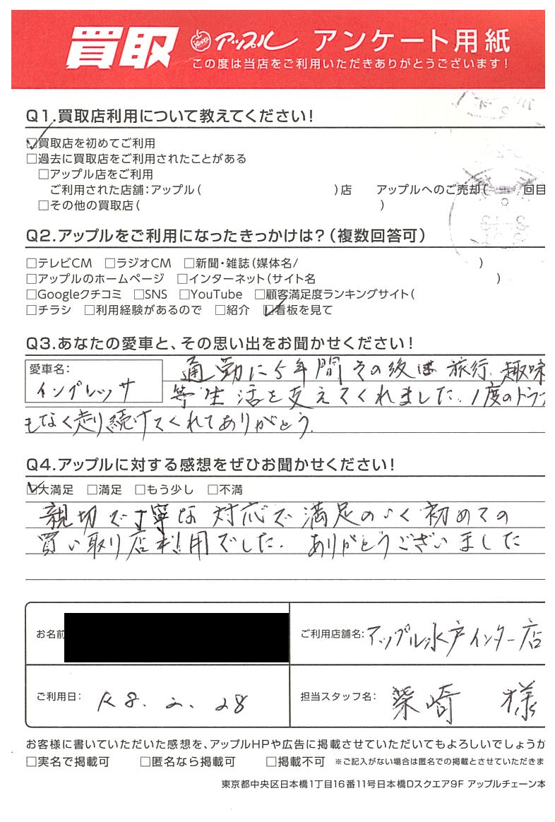 水戸市 I様 車名:スバル インプレッサスポーツ