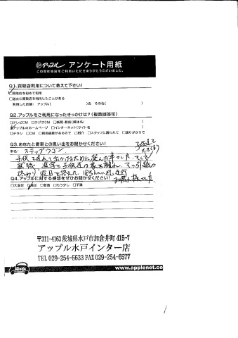 お車のご相談・ 査定だけでもOK! カンタン 入力 30秒 アップルがブランド買取始めました! お電話でも受付中! 受付時間10:00 ~ 18:30 0120-366-310 お車のご相談・ 査定だけでもOK! カンタン 入力 30秒 アップルがブランド買取始めました! お電話でも受付中! 受付時間10:00 ~ 18:30 0120-366-310 アップルがブランド買取始めました! お電話でも受付中! 受付時間10:00 ~ 18:30 0120-366-310 店舗情報 在庫車 スタッフ紹介 ブログ お客様の声 キャンペーン お得 無料査定 click お客様の声 ご記入日: 2018/08/28 I様 Q.あなたと愛車との思い出をお聞かせください!子供を連れて出かけるために選んだ車でした。そして子供達も大きくなり就職、進学で子供達は家を離れ、その引っ越しが終わり役目を終えた。18万㎞に近い走行お疲れ様でした。担当スタッフ:黒澤 前へ 次へ お客様の声一覧を見る