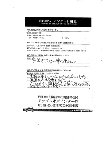 お車のご相談・ 査定だけでもOK! カンタン 入力 30秒 アップルがブランド買取始めました! お電話でも受付中! 受付時間10:00 ~ 18:30 0120-366-310 お車のご相談・ 査定だけでもOK! カンタン 入力 30秒 アップルがブランド買取始めました! お電話でも受付中! 受付時間10:00 ~ 18:30 0120-366-310 アップルがブランド買取始めました! お電話でも受付中! 受付時間10:00 ~ 18:30 0120-366-310 店舗情報 在庫車 スタッフ紹介 ブログ お客様の声 キャンペーン お得 無料査定 click お客様の声 ご記入日: 2018/09/25 T様 Q.あなたと愛車との思い出をお聞かせください!家族で大切に乗って居ました。Q.アップルに対する感想をぜひお聞かせください!査定に来ていただいた方の対応がとても真面目で誠意を感じました。こちらの小さな疑問にも丁寧に答えてくださり何も言うコトないです!担当スタッフ:黒澤 前へ 次へ お客様の声一覧を見る