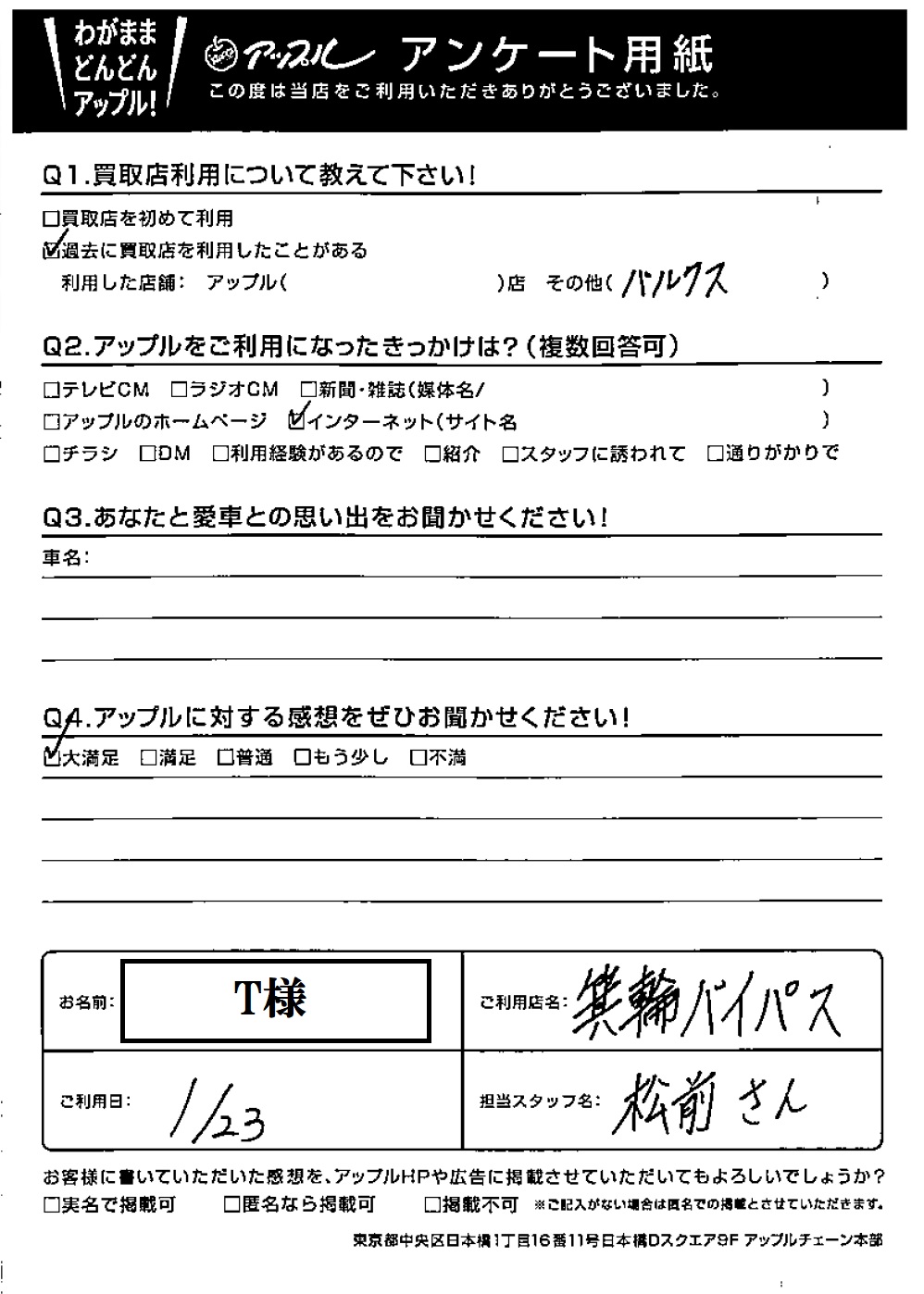 お車のご相談・ 査定だけでもOK! カンタン 入力 30秒 アップルがブランド買取始めました! お電話でも受付中! 受付時間10:00 ~ 19:00 0265-70-1102 お車のご相談・ 査定だけでもOK! カンタン 入力 30秒 アップルがブランド買取始めました! お電話でも受付中! 受付時間10:00 ~ 19:00 0265-70-1102 アップルがブランド買取始めました! お電話でも受付中! 受付時間10:00 ~ 19:00 0265-70-1102 店舗情報 在庫車 スタッフ紹介 ブログ お客様の声 キャンペーン 無料査定 click お客様の声 ご記入日: 2021/01/23 T様 Q アップルに対する感想をぜひお聞かせください!感想:大満足 前へ 次へ お客様の声一覧を見る