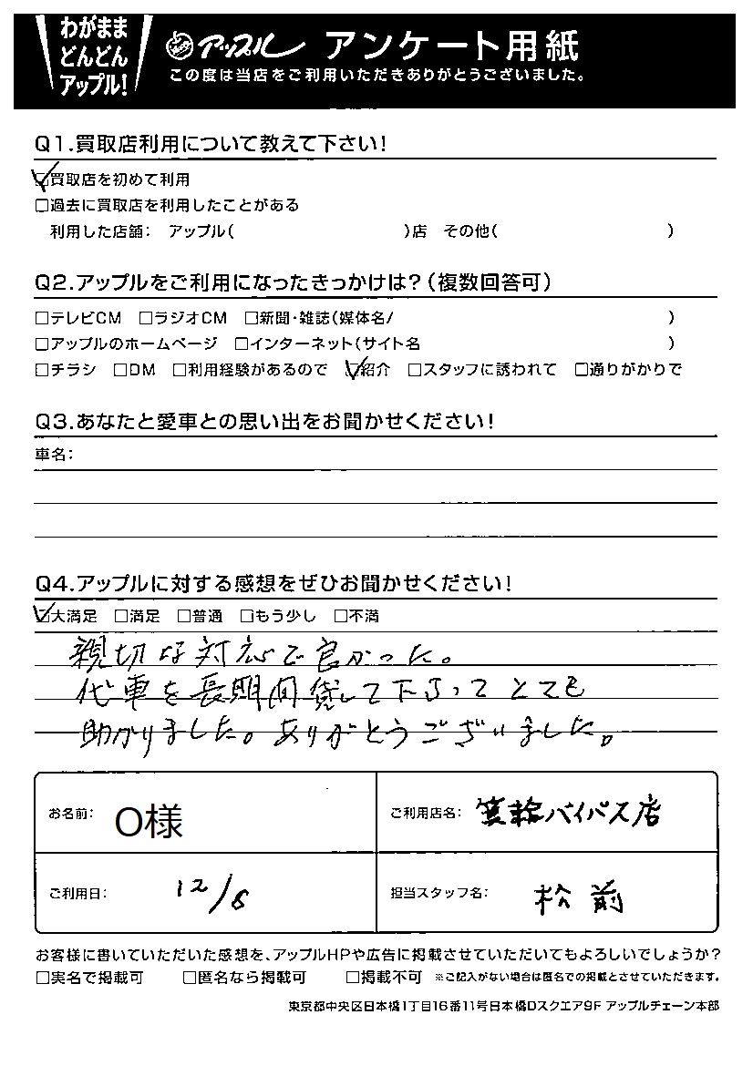 お車のご相談・ 査定だけでもOK! カンタン 入力 30秒 アップルがブランド買取始めました! お電話でも受付中! 受付時間10:00 ~ 19:00 0265-70-1102 お車のご相談・ 査定だけでもOK! カンタン 入力 30秒 アップルがブランド買取始めました! お電話でも受付中! 受付時間10:00 ~ 19:00 0265-70-1102 アップルがブランド買取始めました! お電話でも受付中! 受付時間10:00 ~ 19:00 0265-70-1102 店舗情報 在庫車 スタッフ紹介 ブログ お客様の声 キャンペーン 無料査定 click お客様の声 ご記入日: 2021/12/06 O様 Q アップルに対する感想をぜひお聞かせください!感想:大満足親切な対応で良かった。代車を長期間貸して下さってとても助かりました。ありがとうございました。 前へ 次へ お客様の声一覧を見る