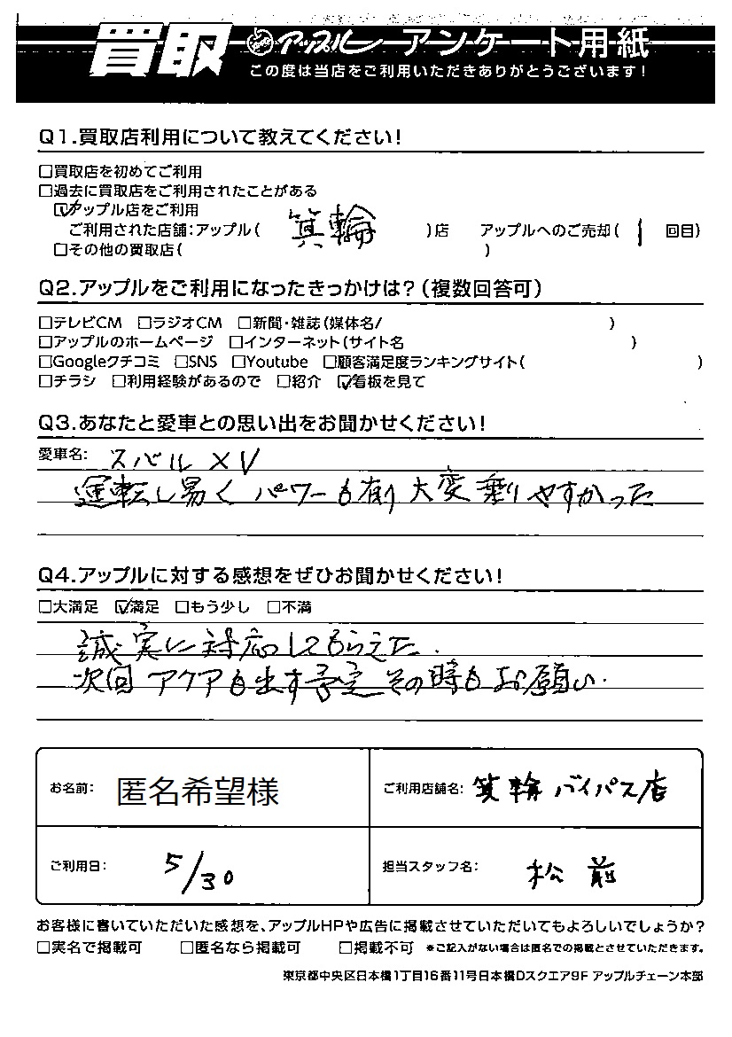 匿名希望様 車名:スバル インプレッサXV (~2017年5月)