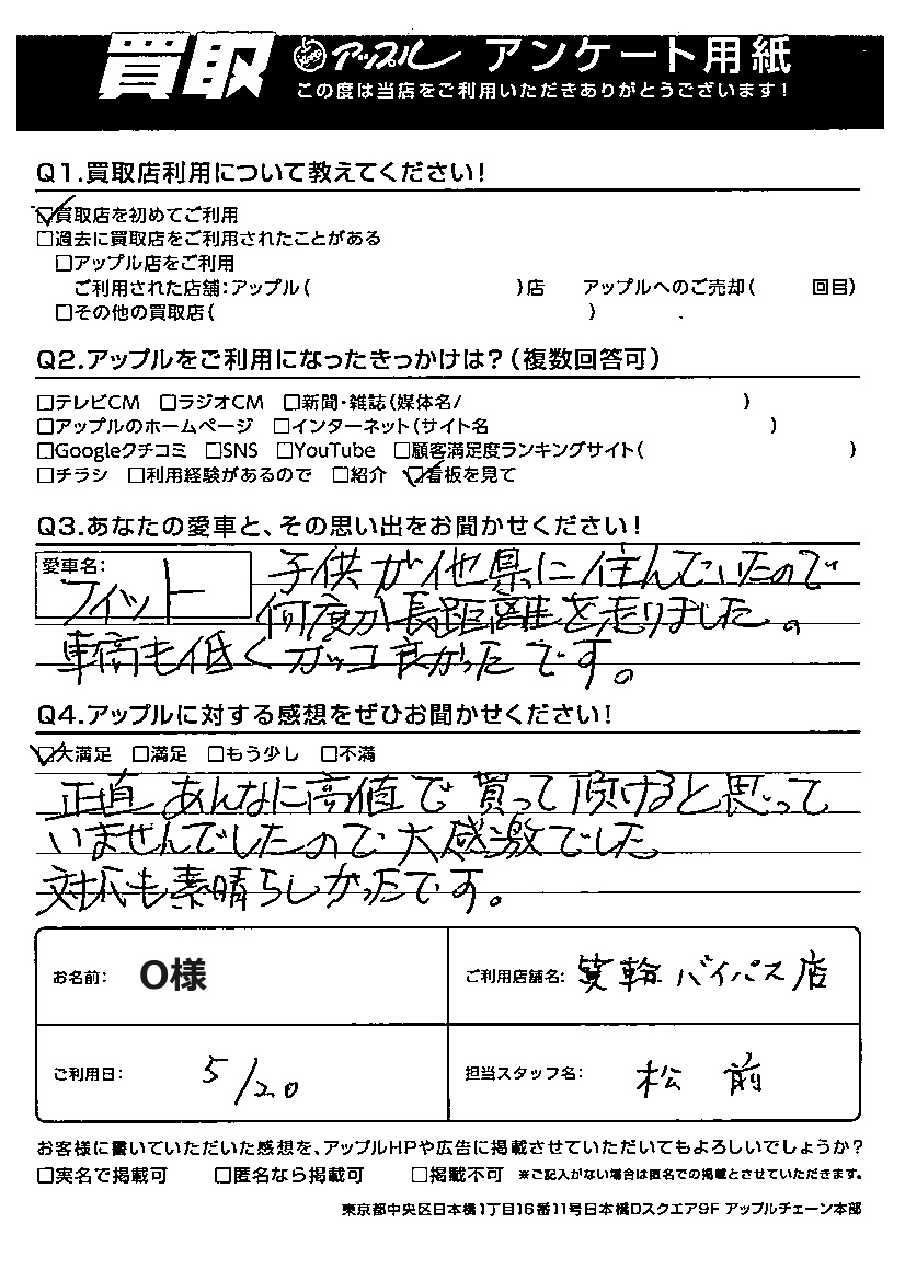 O様 車名:ホンダ フィット(H25年9月以降のハイブリッド含む)