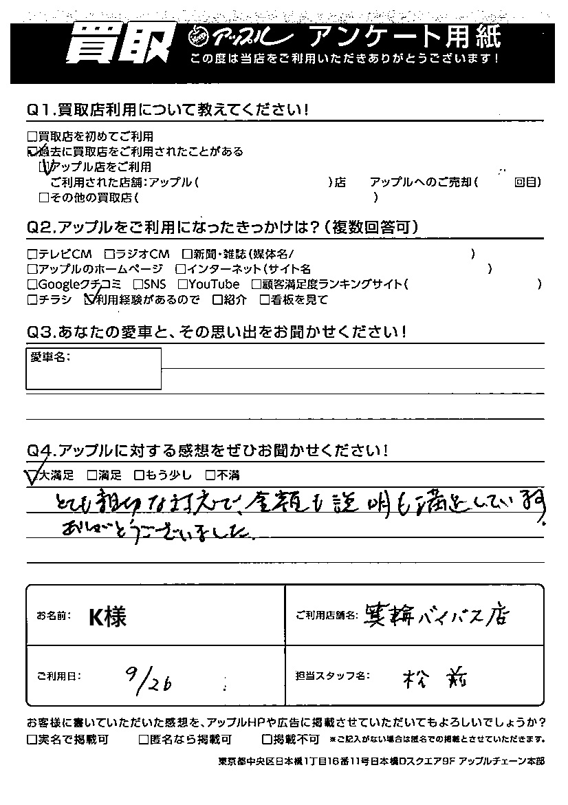 お車のご相談・ 査定だけでもOK! カンタン 入力 30秒 アップルがブランド買取始めました! お電話でも受付中! 受付時間10:00 ~ 19:00 0265-70-1102 お車のご相談・ 査定だけでもOK! カンタン 入力 30秒 アップルがブランド買取始めました! お電話でも受付中! 受付時間10:00 ~ 19:00 0265-70-1102 アップルがブランド買取始めました! お電話でも受付中! 受付時間10:00 ~ 19:00 0265-70-1102 店舗情報 在庫車 スタッフ紹介 ブログ お客様の声 キャンペーン 無料査定 click お客様の声 ご記入日: 2024/09/26 K様 担当:松前Q:アップルに対する感想をぜひお聞かせください!!A:大満足! とても親切な対応で、金額も説明も満足しています。 ありがとうございました。 前へ 次へ お客様の声一覧を見る