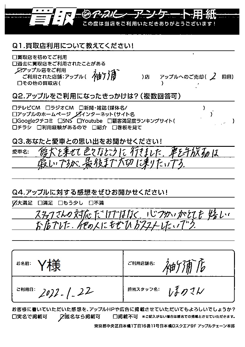 お車のご相談・ 査定だけでもOK! カンタン 入力 30秒 アップルがブランド買取始めました! お電話でも受付中! 受付時間10:00~18:00 0120-36-8607 お車のご相談・ 査定だけでもOK! カンタン 入力 30秒 アップルがブランド買取始めました! お電話でも受付中! 受付時間10:00~18:00 0120-36-8607 アップルがブランド買取始めました! お電話でも受付中! 受付時間10:00~18:00 0120-36-8607 店舗情報 在庫車 スタッフ紹介 ブログ お客様の声 キャンペーン お得 無料査定 click お客様の声 ご記入日: 2022/01/22 Y様 Q あなたと愛車との思い出をお聞かせください!愛犬を乗せて色々なところに行きました。車を手放すのは寂しいですが、最後まで大切に乗りたいです。Q アップルに対する感想をぜひお聞かせください!感想:大満足スタッフさんの対応だけではなく、心づかいがとても嬉しいお店でした。他の人にもぜひおススメしたいです。 前へ 次へ お客様の声一覧を見る