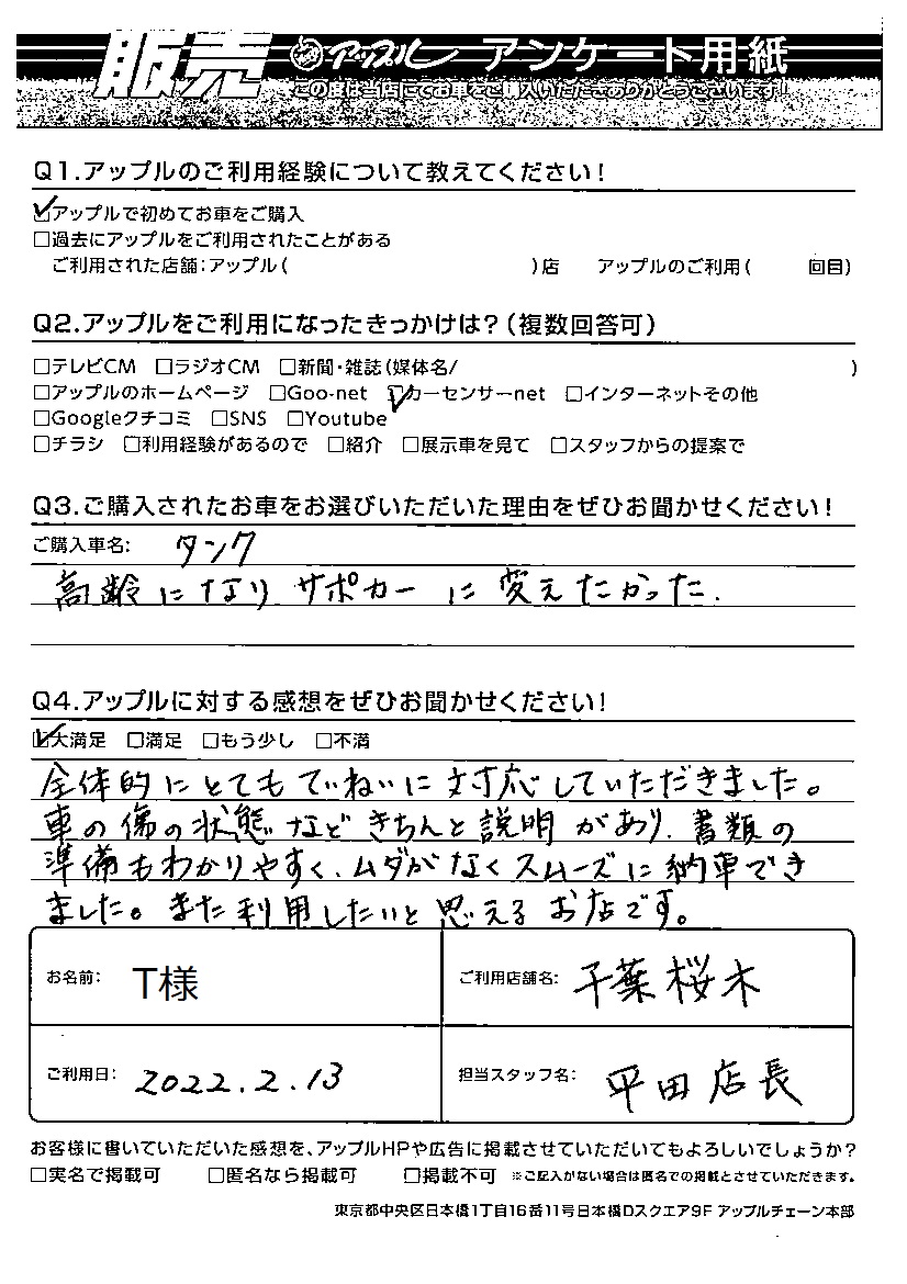 お名前:T 様 愛車名:トヨタ タンク 担当スタッフ:平田