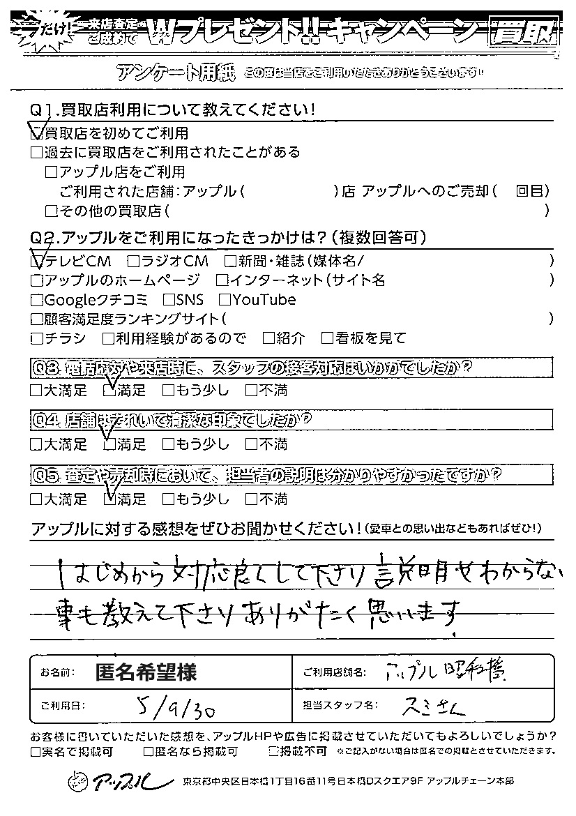 お車のご相談・ 査定だけでもOK! カンタン 入力 30秒 アップルがブランド買取始めました! お電話でも受付中! 受付時間10:00 ~ 19:00 052-363-7811 お車のご相談・ 査定だけでもOK! カンタン 入力 30秒 アップルがブランド買取始めました! お電話でも受付中! 受付時間10:00 ~ 19:00 052-363-7811 アップルがブランド買取始めました! お電話でも受付中! 受付時間10:00 ~ 19:00 052-363-7811 店舗情報 在庫車 スタッフ紹介 ブログ お客様の声 キャンペーン 無料査定 click お客様の声 ご記入日: 2023/12/17 匿名希望様 ご利用日: R5年9月30日 担当: 鷲見Q.アップルに対する感想をぜひお聞かせください!はじめから対応良くして下さり説明やわからない事も教えて下さいありがたく思います。 前へ 次へ お客様の声一覧を見る