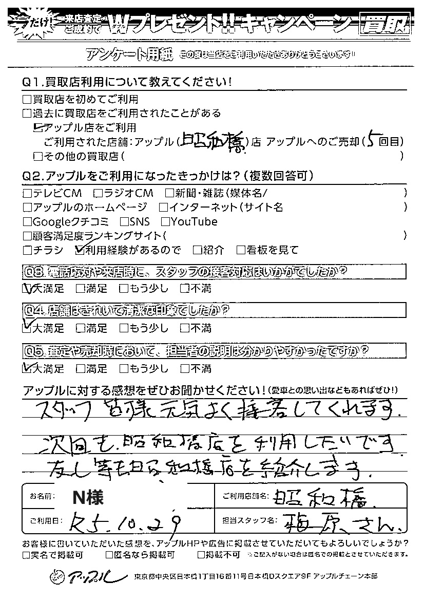 お車のご相談・ 査定だけでもOK! カンタン 入力 30秒 アップルがブランド買取始めました! お電話でも受付中! 受付時間10:00 ~ 19:00 052-363-7811 お車のご相談・ 査定だけでもOK! カンタン 入力 30秒 アップルがブランド買取始めました! お電話でも受付中! 受付時間10:00 ~ 19:00 052-363-7811 アップルがブランド買取始めました! お電話でも受付中! 受付時間10:00 ~ 19:00 052-363-7811 店舗情報 在庫車 スタッフ紹介 ブログ お客様の声 キャンペーン 無料査定 click お客様の声 ご記入日: 2024/02/01 N様 ご利用日:R5年10月29日 担当:梅原アップルに対する感想をぜひお聞かせください!スタッフ皆様 元気よく接客してくれます。次回も昭和橋店を利用したいです。友人等も昭和橋店を紹介します。 前へ 次へ お客様の声一覧を見る