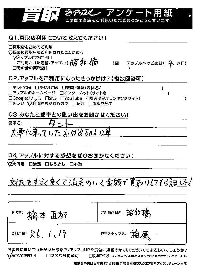 橋本 直都様 車名:ダイハツ タント