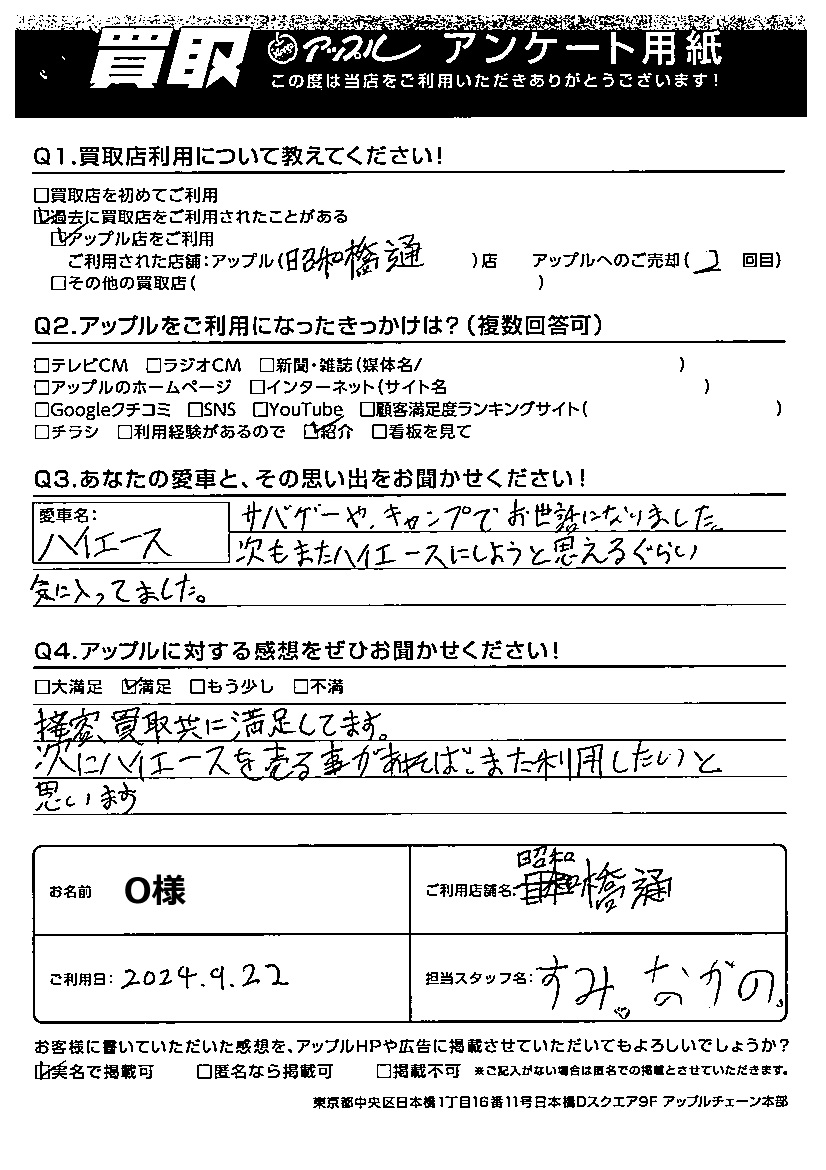 接客・買取共に満足してます。次にハイエースを売ることがあればまた利用したいと思います。