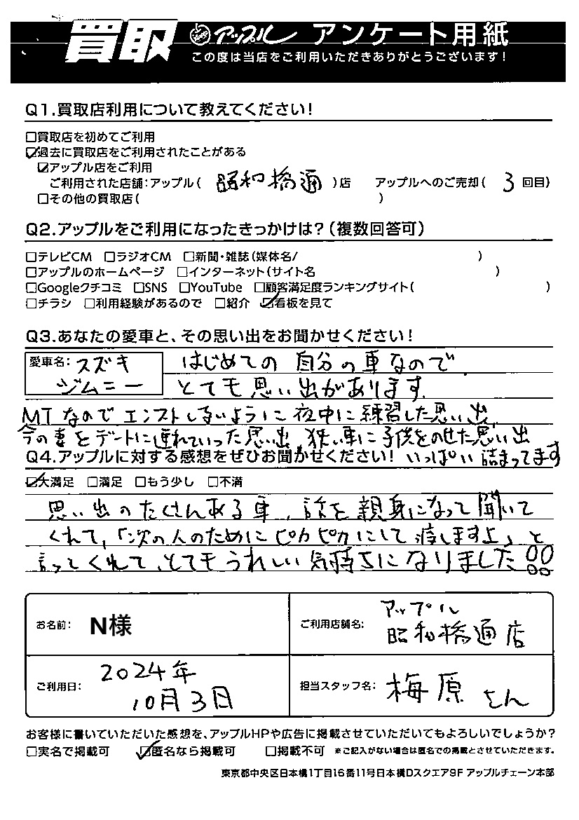 A.愛車名:ジムニー はじめての自分の車なのでとても思い出があります。MTなのでエンストしない