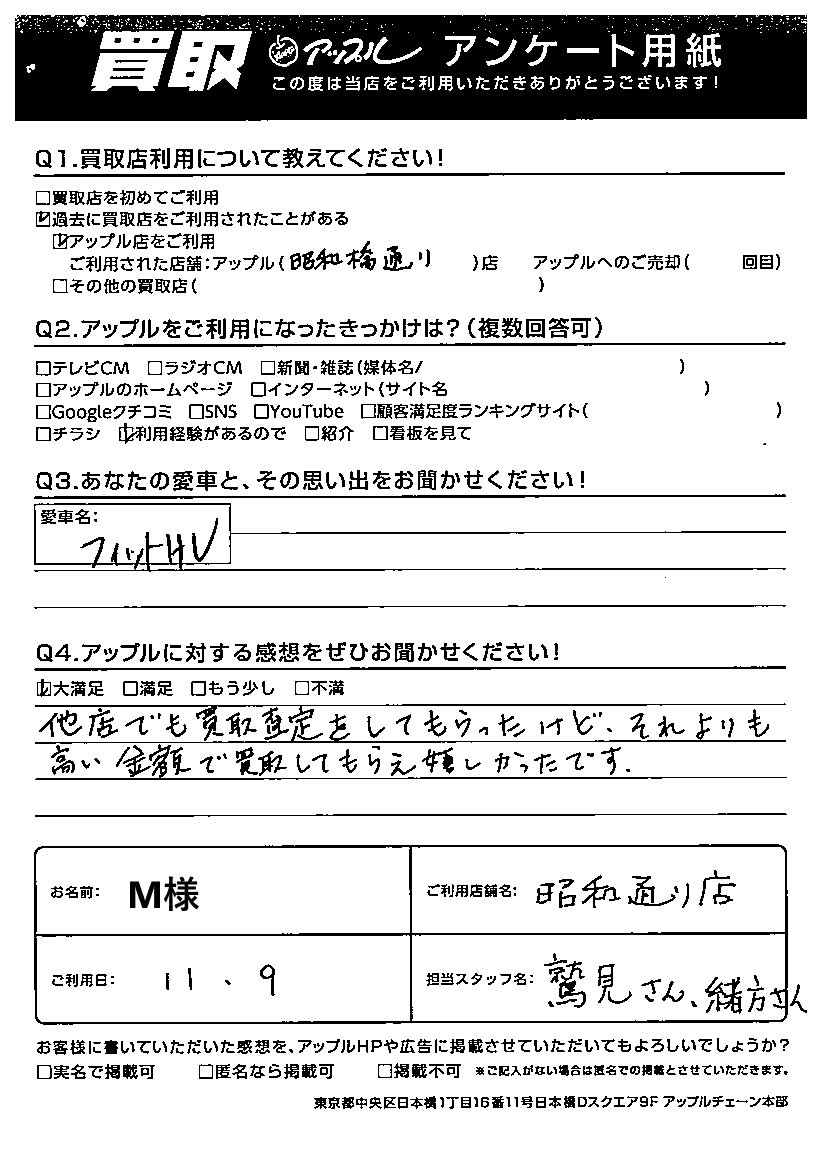 M様 車名:ホンダ フィットハイブリッド(~H25年9月)