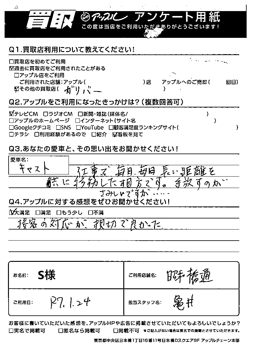 A.愛車名:キャスト 仕事で毎日毎日長い距離を共に移動した相方です。手放すのがさみしいです