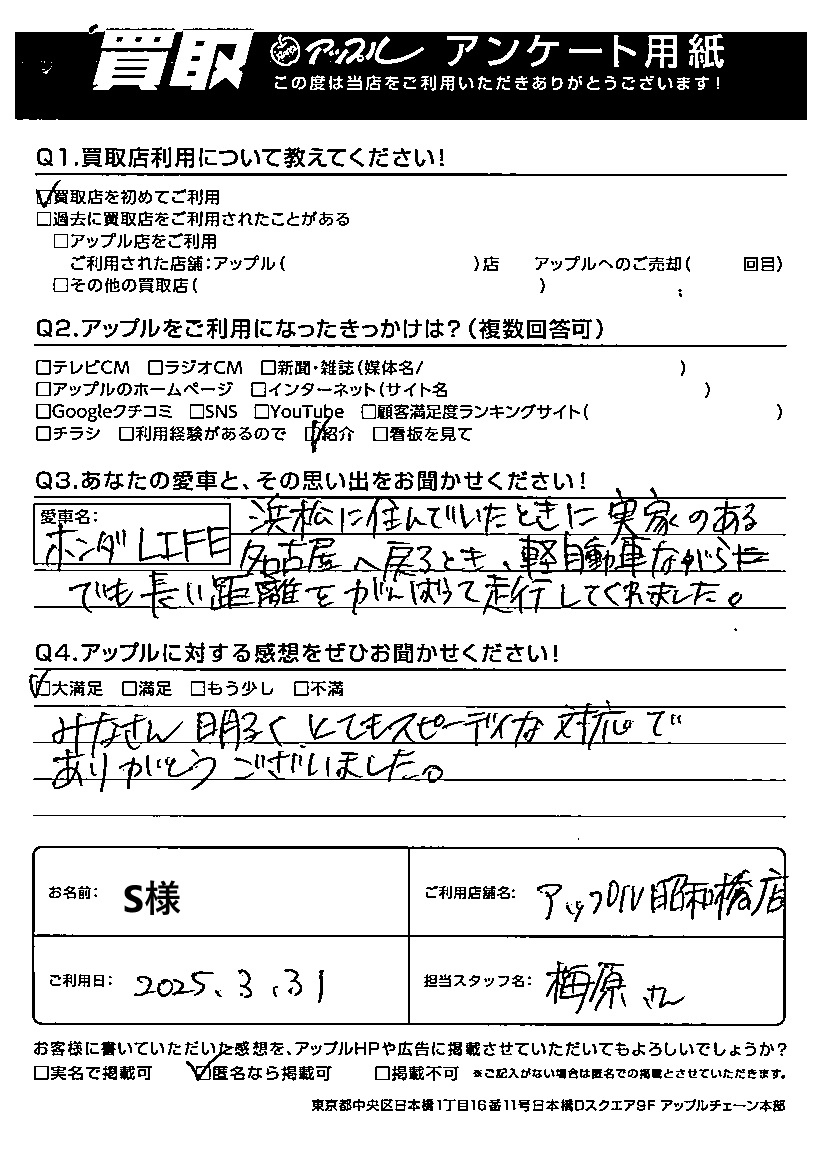 みなさん明るくとてもスピーディな対応で、ありがとうございました。