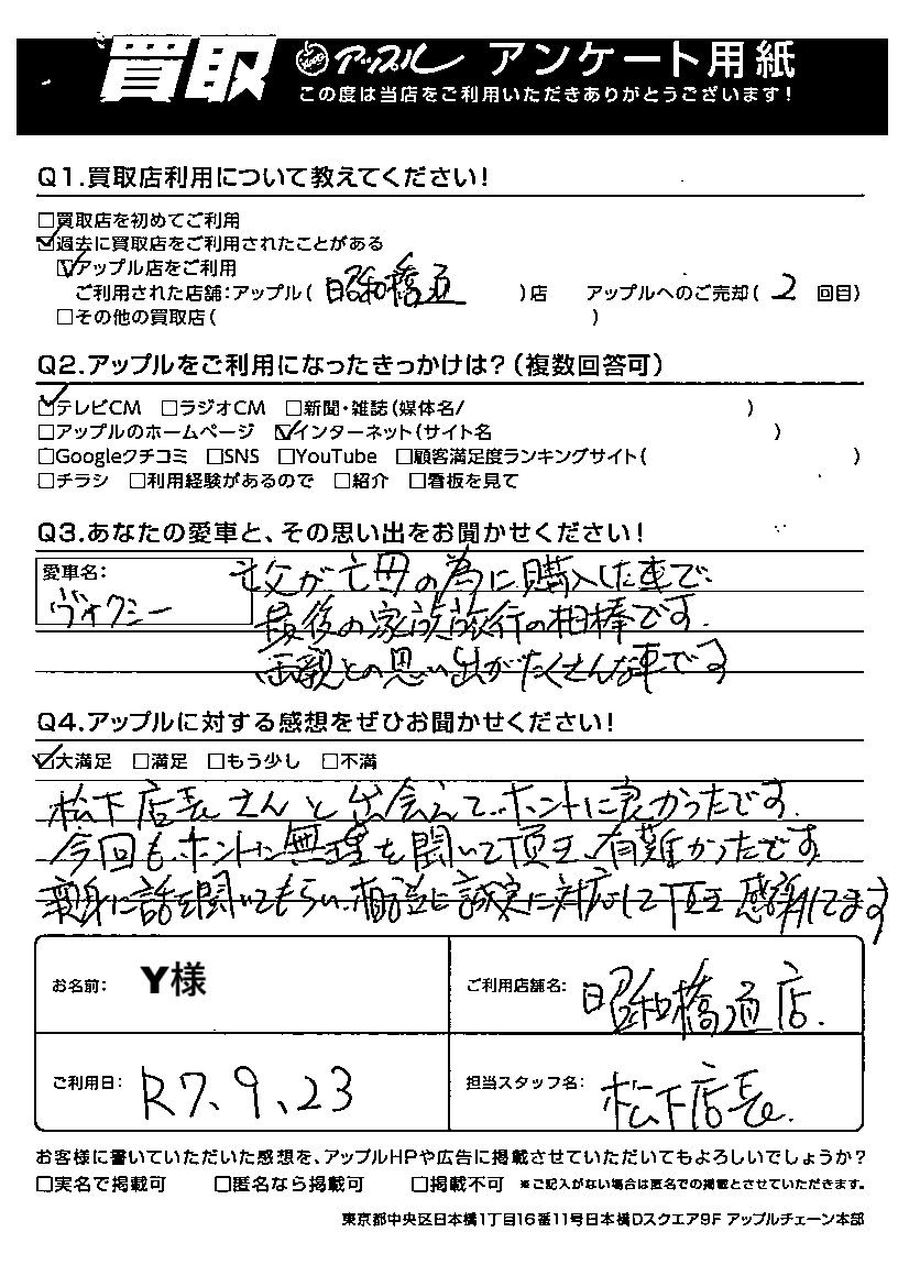 松下店長さんと出会えてホントに良かったです。今回もホントに無理を聞いて頂き有難かったです。親身に話を聞