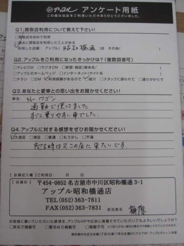 お車のご相談・ 査定だけでもOK! カンタン 入力 30秒 アップルがブランド買取始めました! お電話でも受付中! 受付時間10:00 ~ 19:00 052-363-7811 お車のご相談・ 査定だけでもOK! カンタン 入力 30秒 アップルがブランド買取始めました! お電話でも受付中! 受付時間10:00 ~ 19:00 052-363-7811 アップルがブランド買取始めました! お電話でも受付中! 受付時間10:00 ~ 19:00 052-363-7811 店舗情報 在庫車 スタッフ紹介 ブログ お客様の声 キャンペーン 無料査定 click お客様の声 ご記入日: 2017/06/06 匿名希望N-ワゴン様 売る時は又この店に来たいです。 前へ 次へ お客様の声一覧を見る